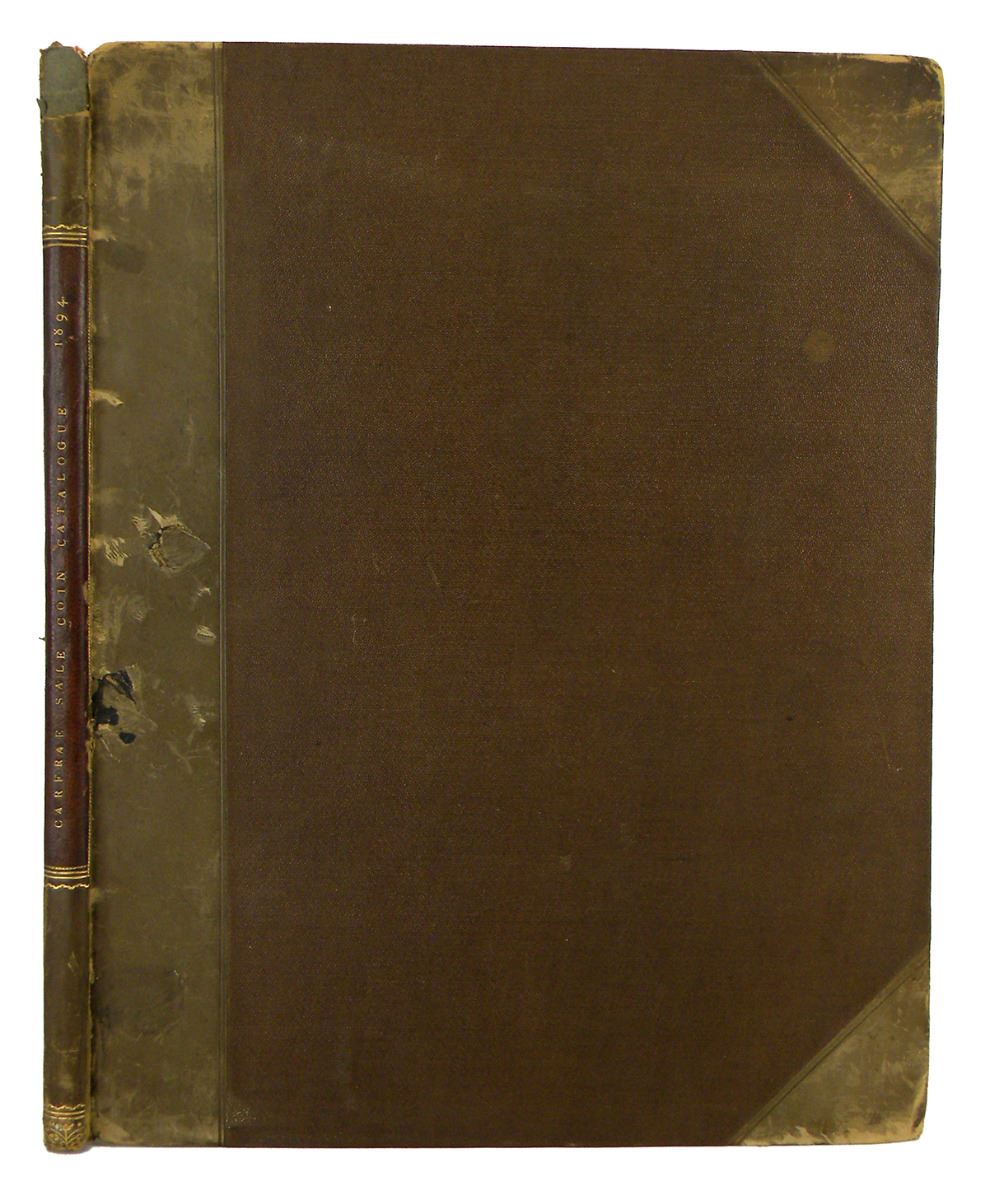 Sotheby, Wilkinson & Hodge. CATALOGUE OF THE COLLECTION OF GREEK COINS IN GOLD, SILVER AND ELECTRUM, THE PROPERTY OF ROBERT CARFRAE, ESQ. F.S.A., SCOT. (OF EDINBURGH). London, May 23-25, 1894. 4to, contemporary brown half calf; spine gilt, with brown morocco spine label, gilt. (2), 61, (1) pages; 363 lots; 11 fine plates. Hand-priced in ink, with contemporary annotations throughout. Binding rubbed and worn, but sound, with institutional "withdrawn" stamps inside; very good. See catalogue for full description.