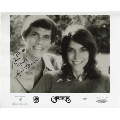 <B>The Carpenters Signed Photo.</B></I> A b&w 8" x 10" promo photo of the brother-sister duo inscribed and signed by both Karen and Richard in black fountain pen. In Excellent condition.<BR><BR><b>Shipping:</b> Flat Material, Small (<a target="_blank" href="http://www.heritageauctions.com/common/shipping.php">view shipping information</a>) <BR><BR><B>Important notice: