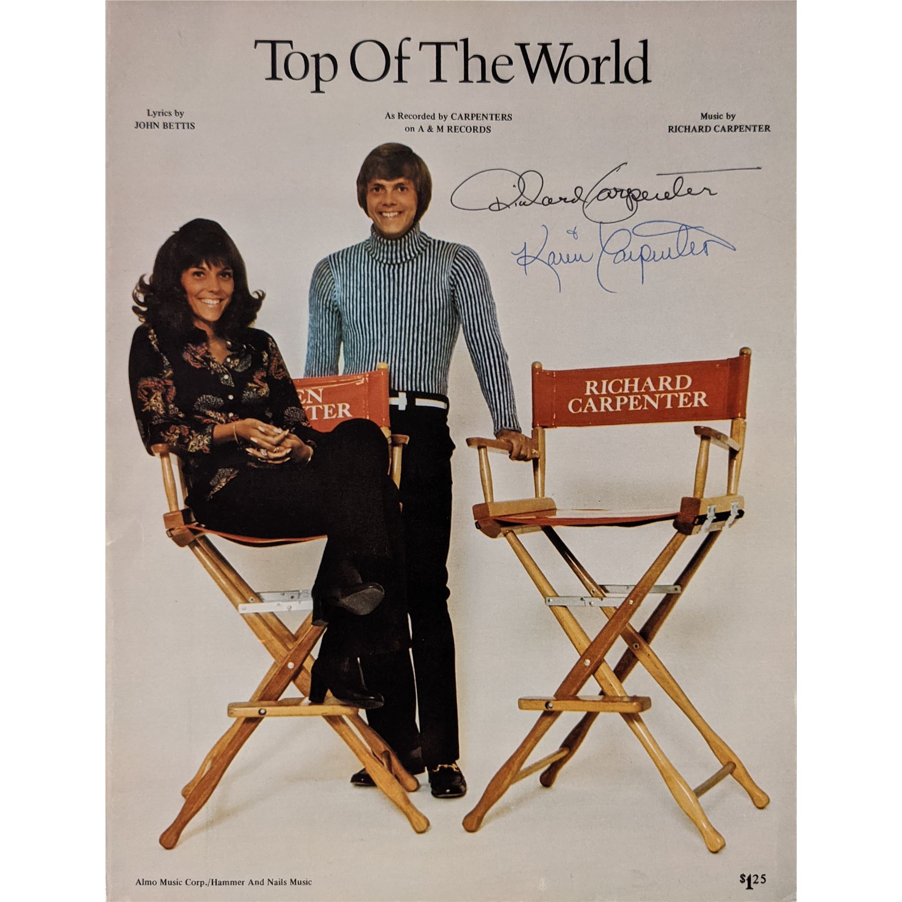 The Carpenters signed photo autographed by Karen and Richard Carpenter. 8x10 inches