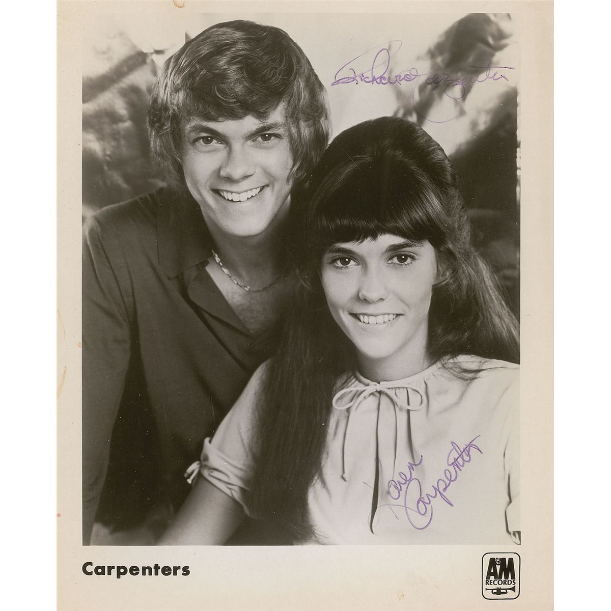 Glossy 8 x 10 A&M Records publicity photo, signed in black felt tip by Karen Carpenter and Richard Carpenter. A few light creases and some soiling and mounting remnants to edges, otherwise fine condition. A desirable uninscribed piece.
