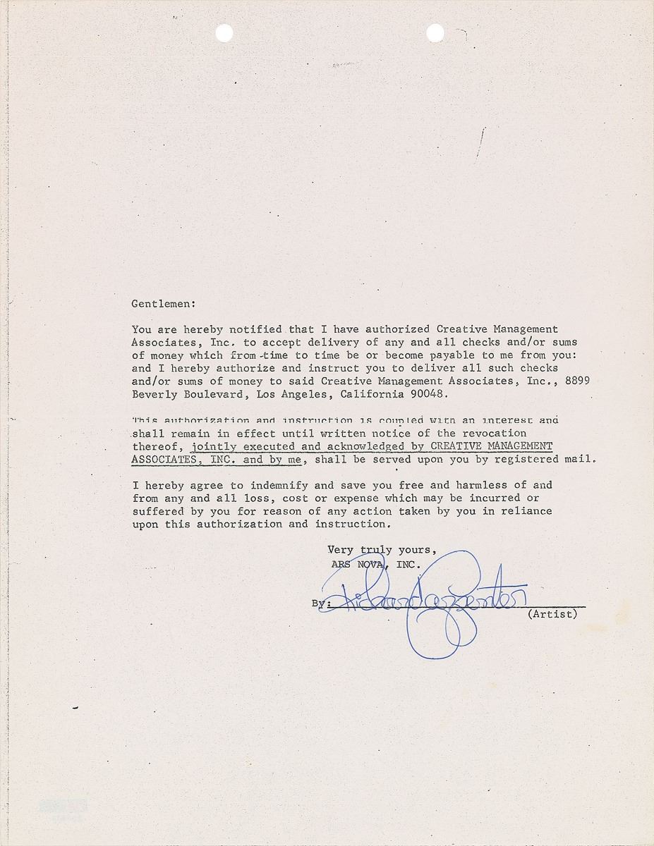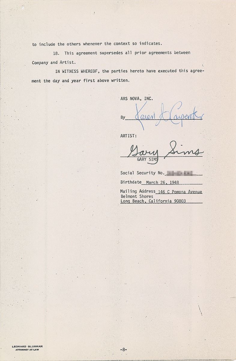 Two DSs: an exclusive services agreement between ARS Nova Inc., and Gary Sims for a one-year contract extension, eight pages, April 1, 1972, signed at the conclusion in blue ballpoint on behalf of ARS Nova, “Karen A. Carpenter”; and an authorized statement from ARS Nova affirming that Creative Management Associates will accept delivery of future payments, signed at the conclusion in blue ballpoint, “Richard Carpenter.” In overall fine condition. Accompanied a certificate and a full letter of authenticity from PSA/DNA.