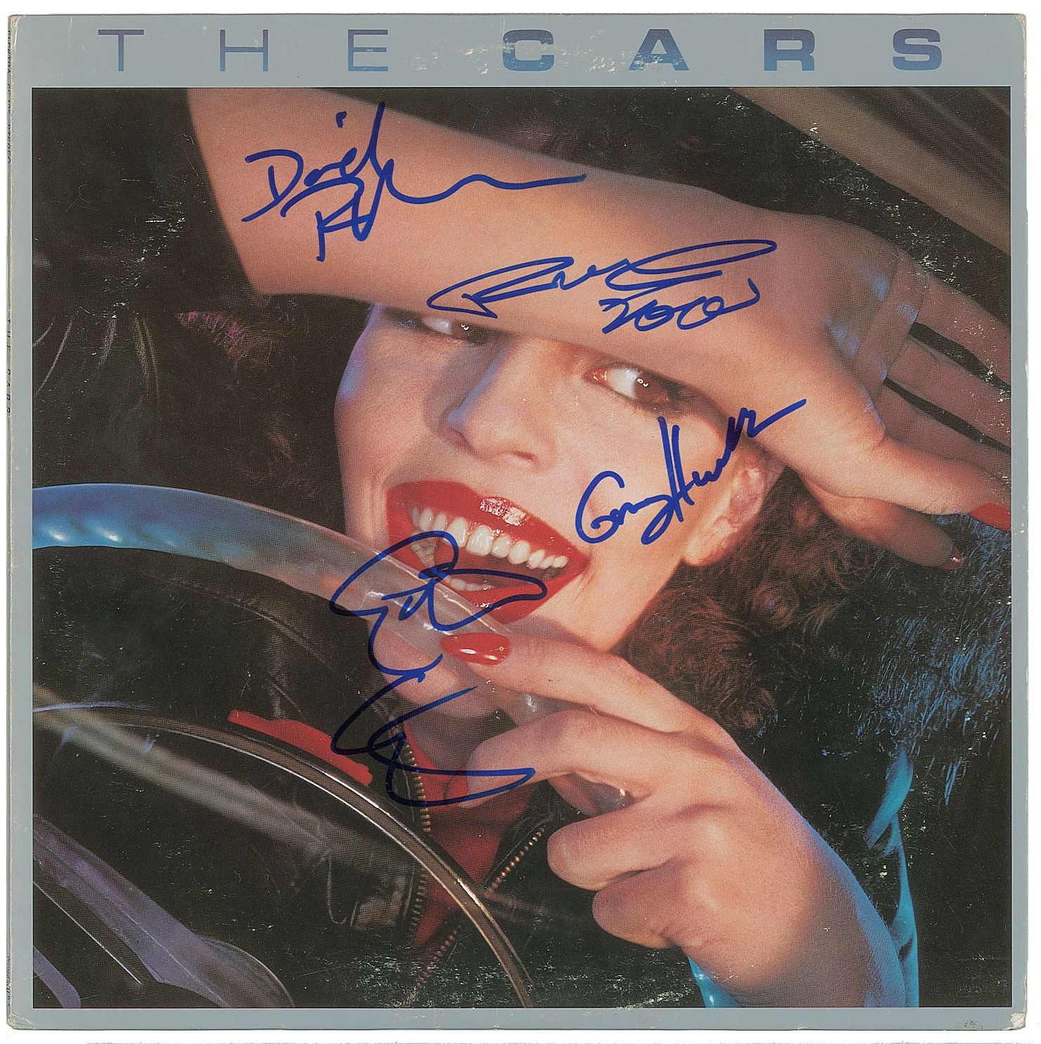 Self-titled debut album signed on the front cover in blue felt tip by Ric Ocasek, Elliot Easton, Greg Hawkes, and David Robinson. In fine condition, with light scuffing. The record is included.