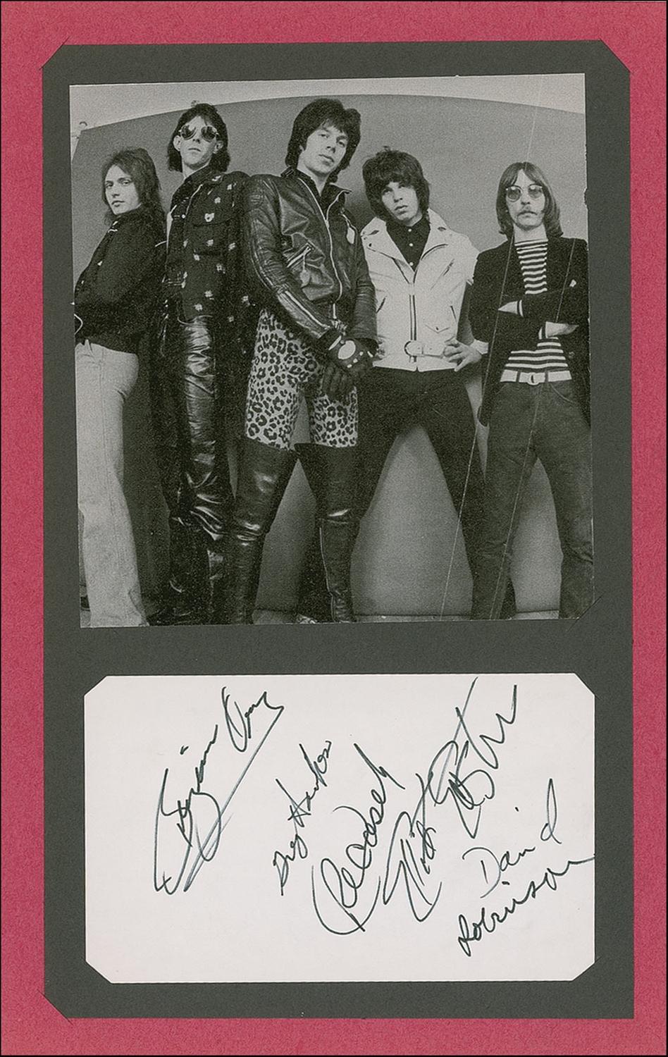 In-person felt tip signatures of Benjamin Orr, Ric Ocasek, David Robinson, Greg Hawkes, and Elliot Easton on an off-white 5 x 3 card. Card is removably attached by its corner tabs to a larger sheet, along with a group photo, in turn removably attached to a 6.5 x 10.25 sheet. In fine condition.