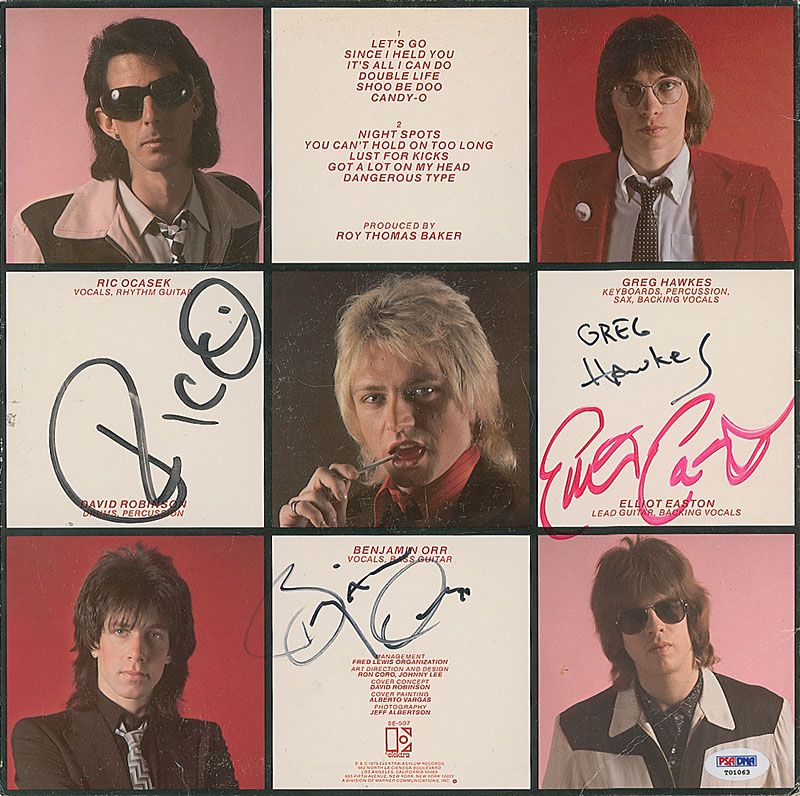 Candy-O album signed on the back cover in black and red felt tip by Ric Ocasek, Benjamin Orr, Greg Hawkes, and Elliot Easton, and in blue ballpoint on the front cover by David Robinson. In fine condition, with creasing to lower right corner of back cover, and some scattered edge creases. The record is included. Accompanied by a full letter of authenticity from PSA/DNA.