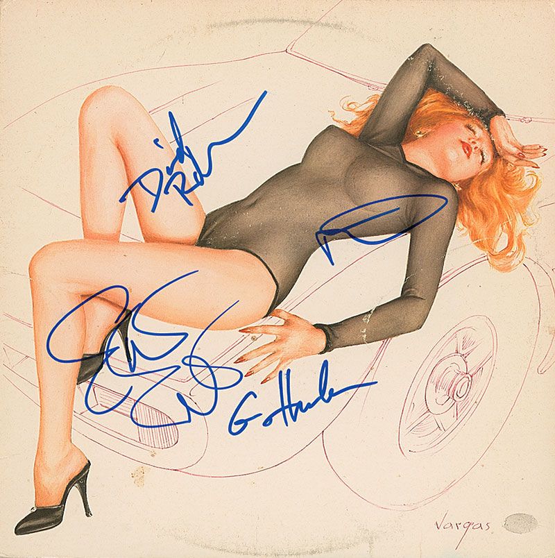 Candy-O album signed on the front cover in blue felt tip by Ric Ocasek, Greg Hawkes, Elliot Easton, and David Robinson. Mild ‘ring of wear’ to front cover, a few scattered creases to covers, small area of adhesive remnant to lower right corner, and some surface loss to spine, otherwise fine condition. The record is included.