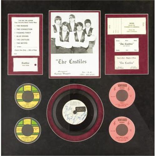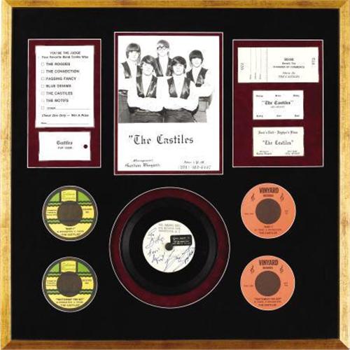 <B>Bruce Springsteen/The Castiles Signed Record & Memorabilia Display.</B></I> Before he was the Boss of the E Street Band, Bruce Springsteen, starting at the tender age of 15, played lead guitar in The Castiles from 1965-67. It was during this time that Springsteen honed not only his singing and playing skills, but also his songwriting abilities. The band recorded a single on acetate ("Baby I" backed with "That's What You Get", written in the back of a car en route to the studio) during their brief existence, and it has never been released. Seven copies were printed -- one for each of the six band members and their manager -- and only three are believed to still exist. Featured is one of those exceedingly rare acetates, one that has the added bonus of being inscribed "To Billy -- Here's the first" and signed by Springsteen in blue ink. The 45rpm acetate has been matted and framed along with some other rare Castiles memorabilia, of which very little still exists today. Included are four unused labels for the unreleased single, two Castile business cards, an unused ticket to a Castiles performance at a benefit function, a Castiles fan club card, an unused ballot from a battle-of-the-bands competition that the band played in, and a b&w 8" x 10" promo photo of the Castiles taken in 1966 -- the only copy known to exist. The items have been professionally matted and framed to an overall size of 24" x 24.5" and are in overall Very Fine to Excellent condition with some mild toning to the cards and ticket and several creases visible on the photo. This is essentially Springsteen's first professional recording, and each of the items accompanying it is exceedingly rare, if not one-of-a-kind. <I>Accompanied by LOA from PSA/DNA.</B></I><BR><BR><b>Shipping:</b> Framed - with Glass, Medium (<a target="_blank" href="http://www.heritageauctions.com/common/shipping.php">view shipping information</a>)