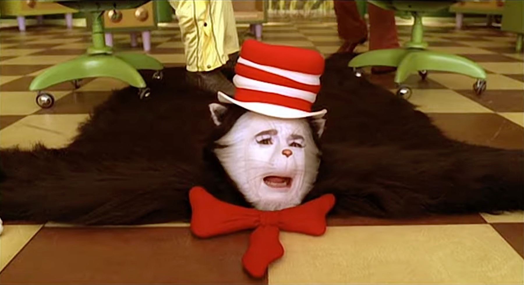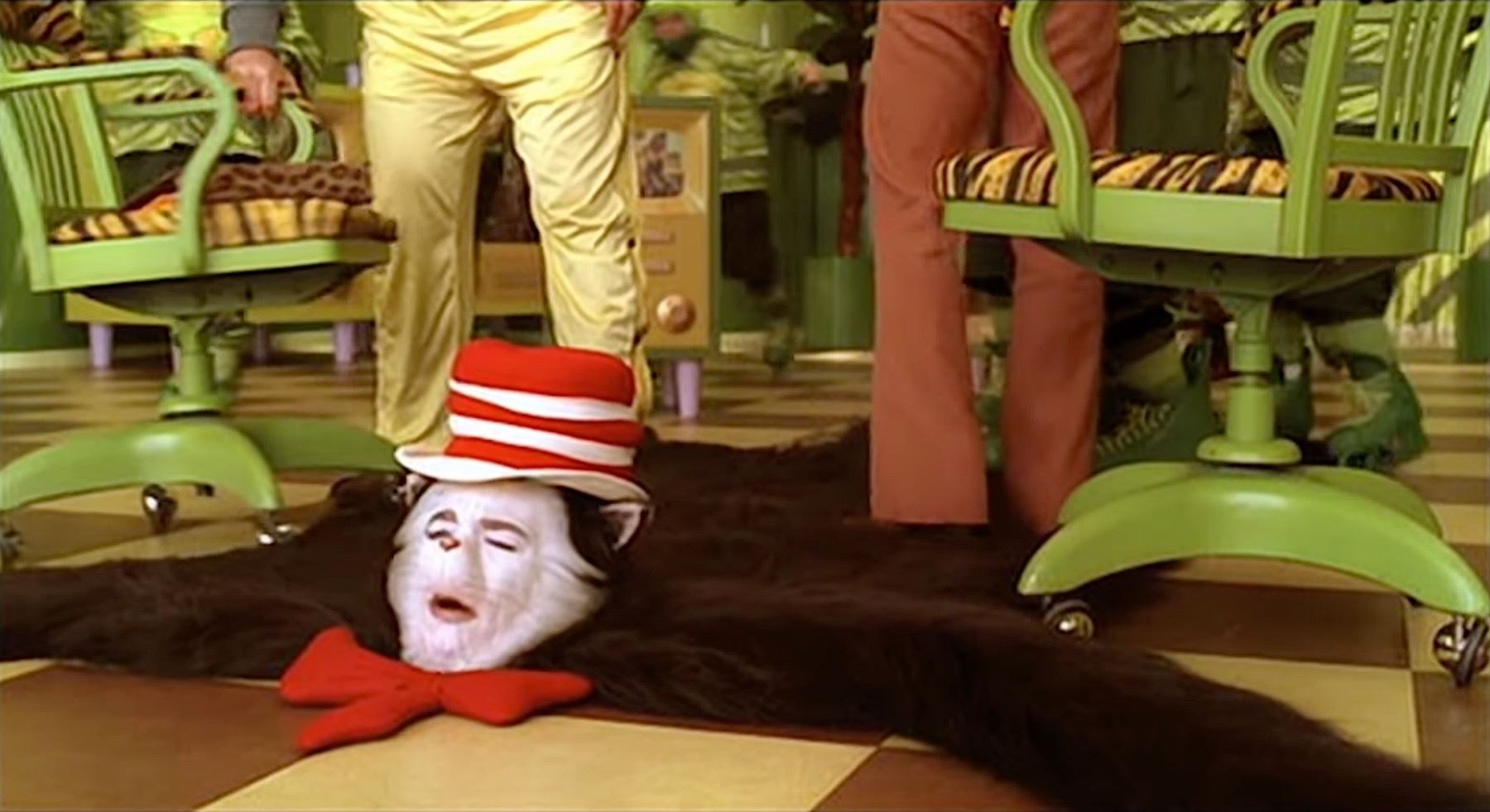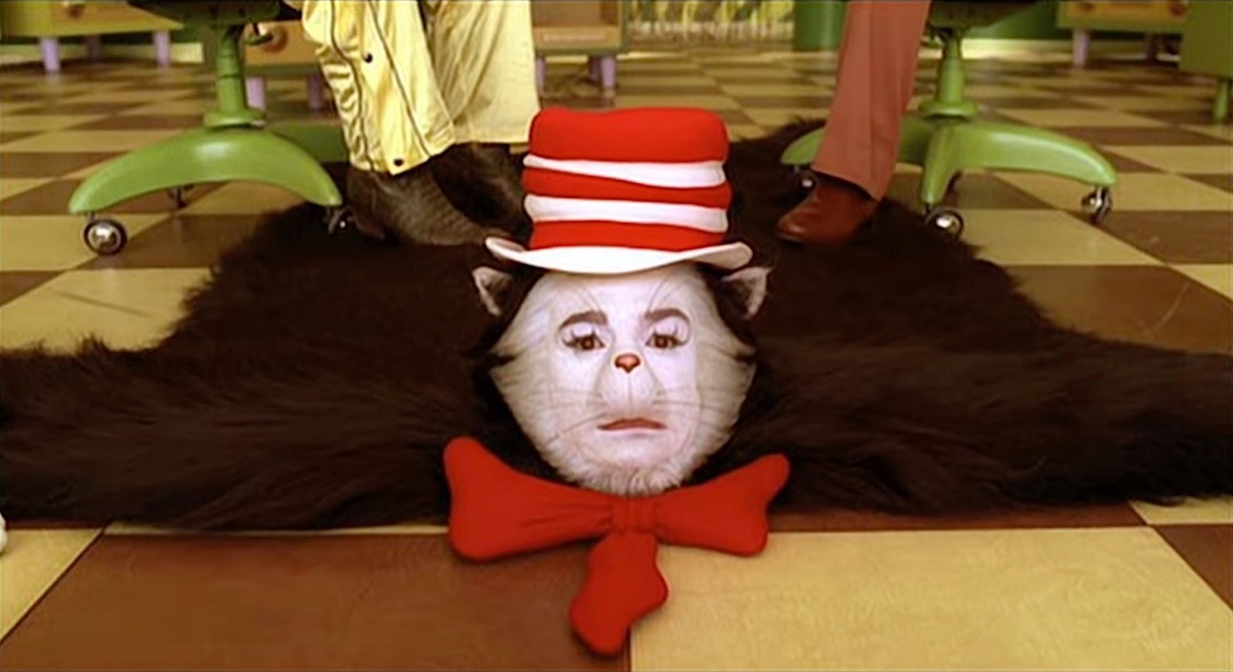 For filming, the production constructed an elevated stage floor so Myers could stand beneath the rug, pushing his head through the neck opening and his arms through concealed sleeves in the forelegs. The result is seen in the memorable deleted scene set in Safari Sam’s Television Store, where the Cat attempts to evade capture by posing as a taxidermy-style rug.