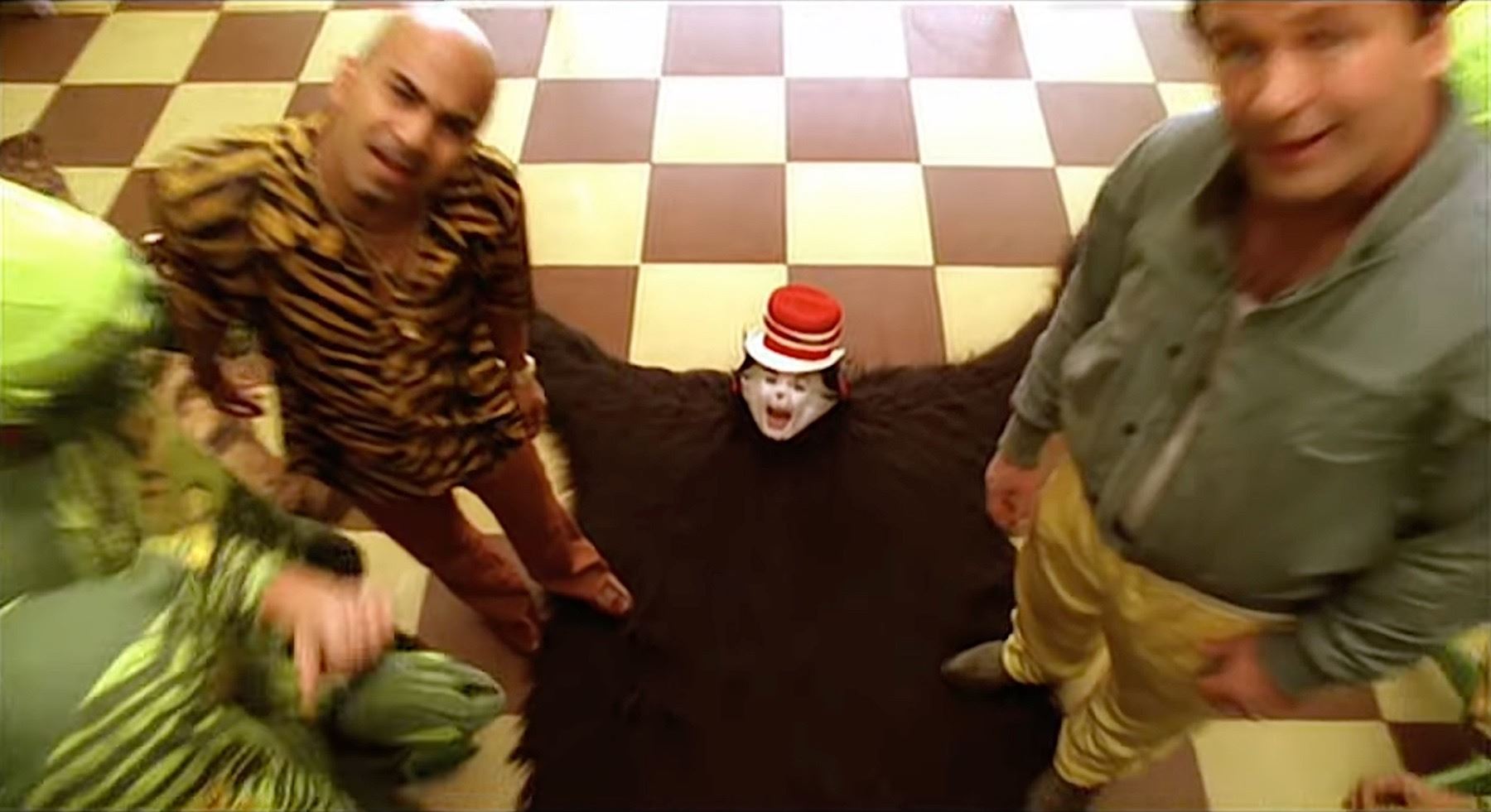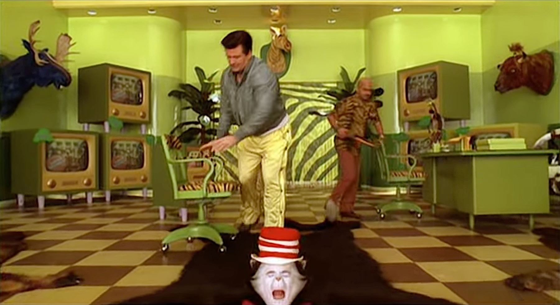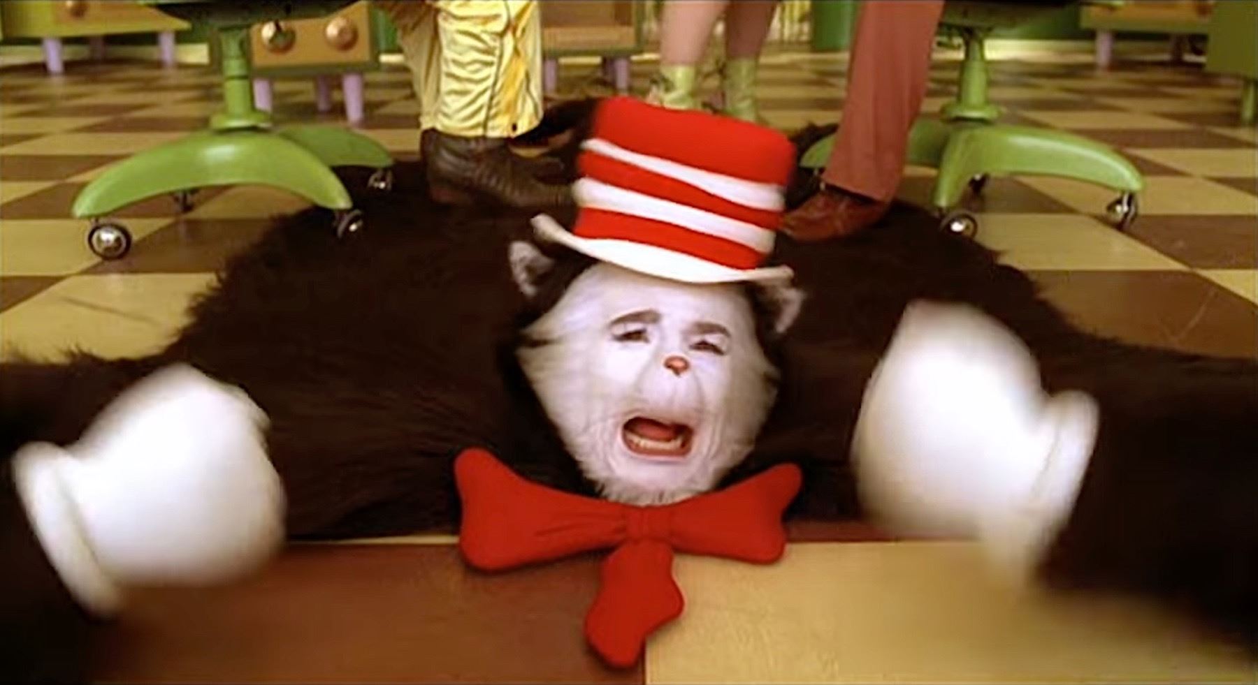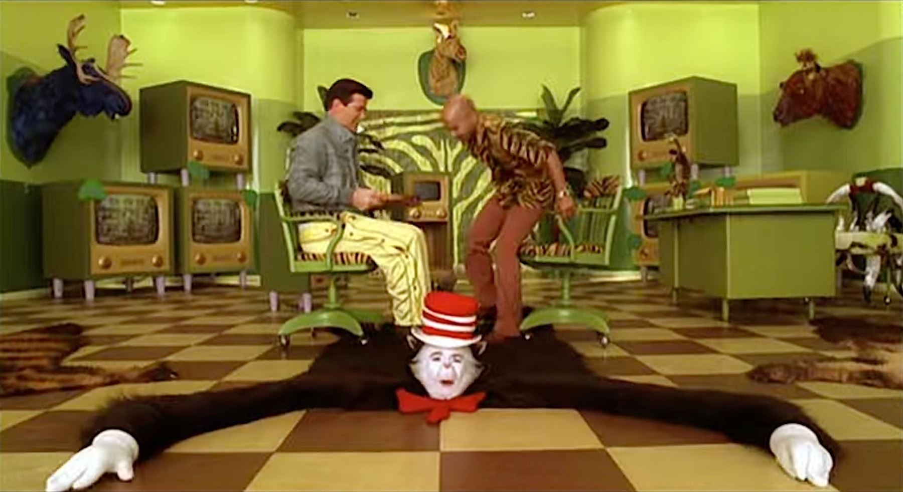 For filming, the production constructed an elevated stage floor so Myers could stand beneath the rug, pushing his head through the neck opening and his arms through concealed sleeves in the forelegs. The result is seen in the memorable deleted scene set in Safari Sam’s Television Store, where the Cat attempts to evade capture by posing as a taxidermy-style rug.