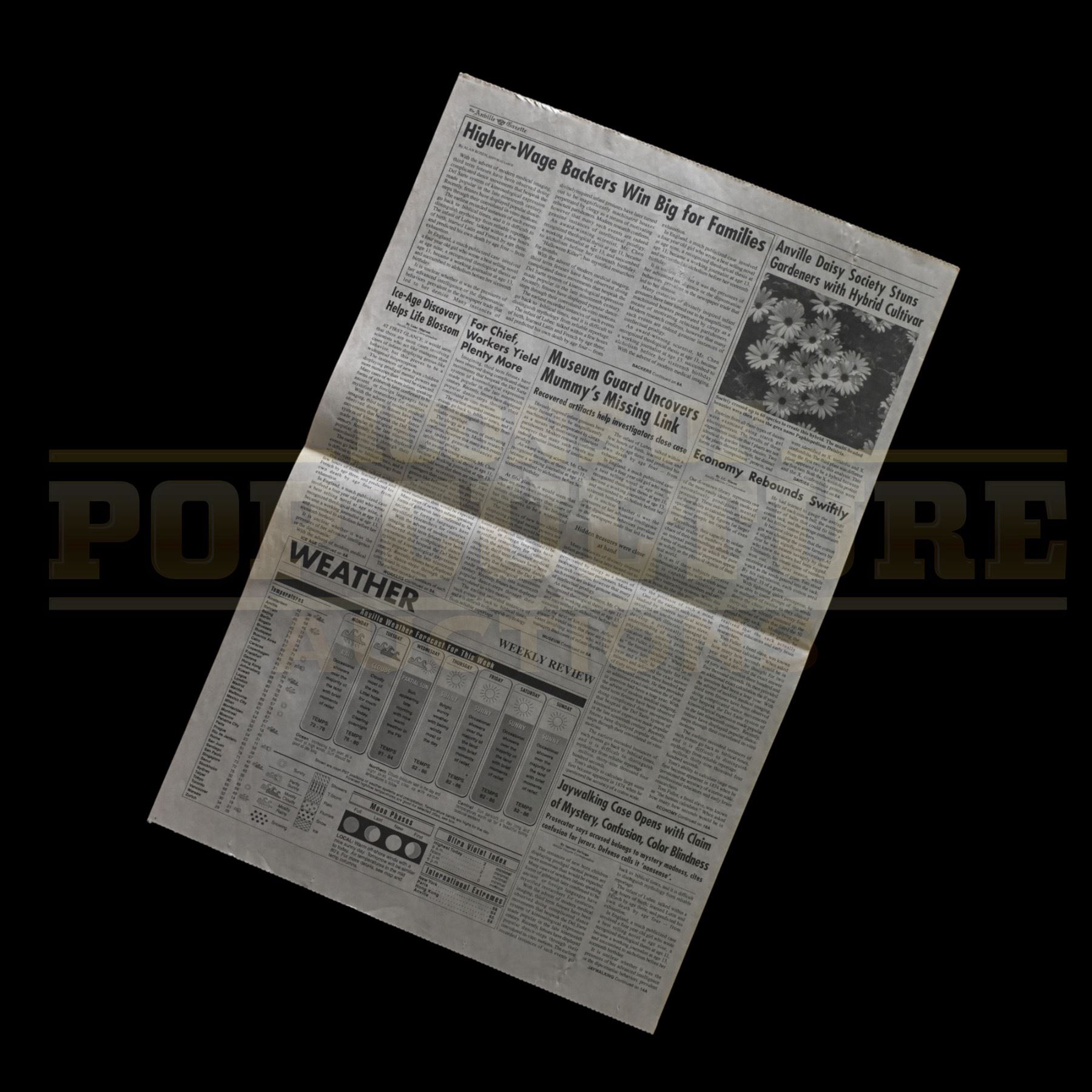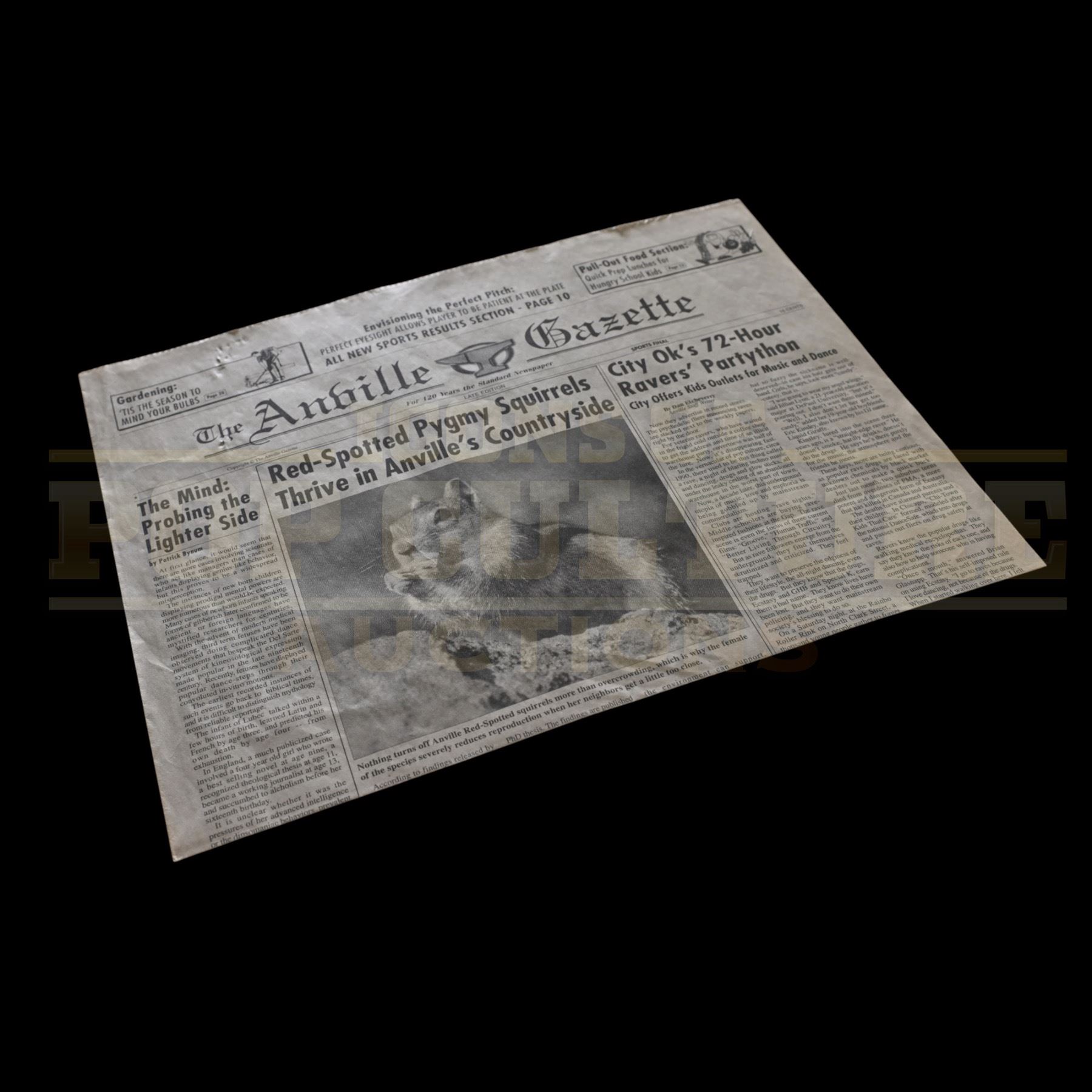 Beautifully crafted in the style of a small-town periodical, the newspaper is filled with tongue-in-cheek articles and headlines that echo the quirky humor of the film’s colorful universe. Among its amusing stories are features such as “Red-Spotted Pygmy Squirrels Thrive in Anville’s Countryside”, “City OK’s 72-Hour Raver’s Partython,” and “The Mind: Probing the Lighter Side.” The back and inner pages are equally detailed, featuring sports sections, weather forecasts, and scientific discoveries, all reflecting the film’s commitment to creating a fully realized and playfully absurd world.