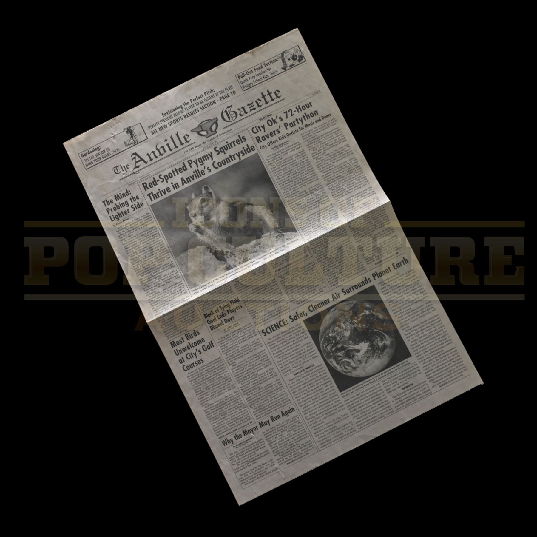 This prop newspaper titled “The Anville Gazette” was custom-designed and printed by the production for use by actors and as set dressing in the live-action adaptation of Dr. Seuss’ The Cat in the Hat (Universal Pictures, 2003).