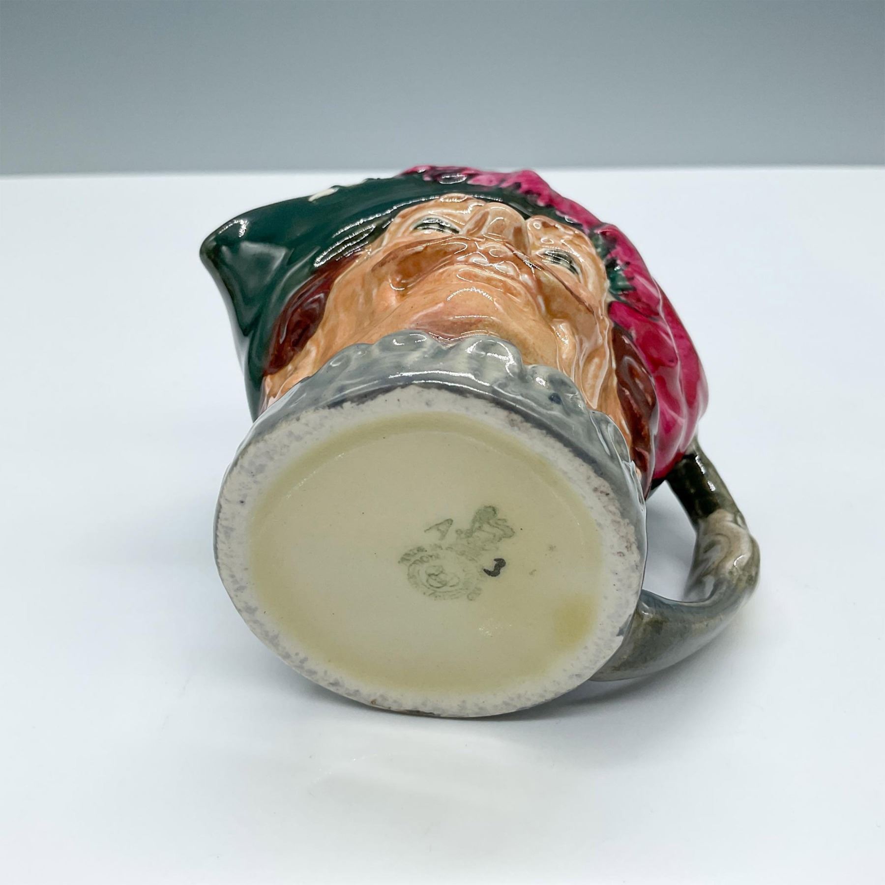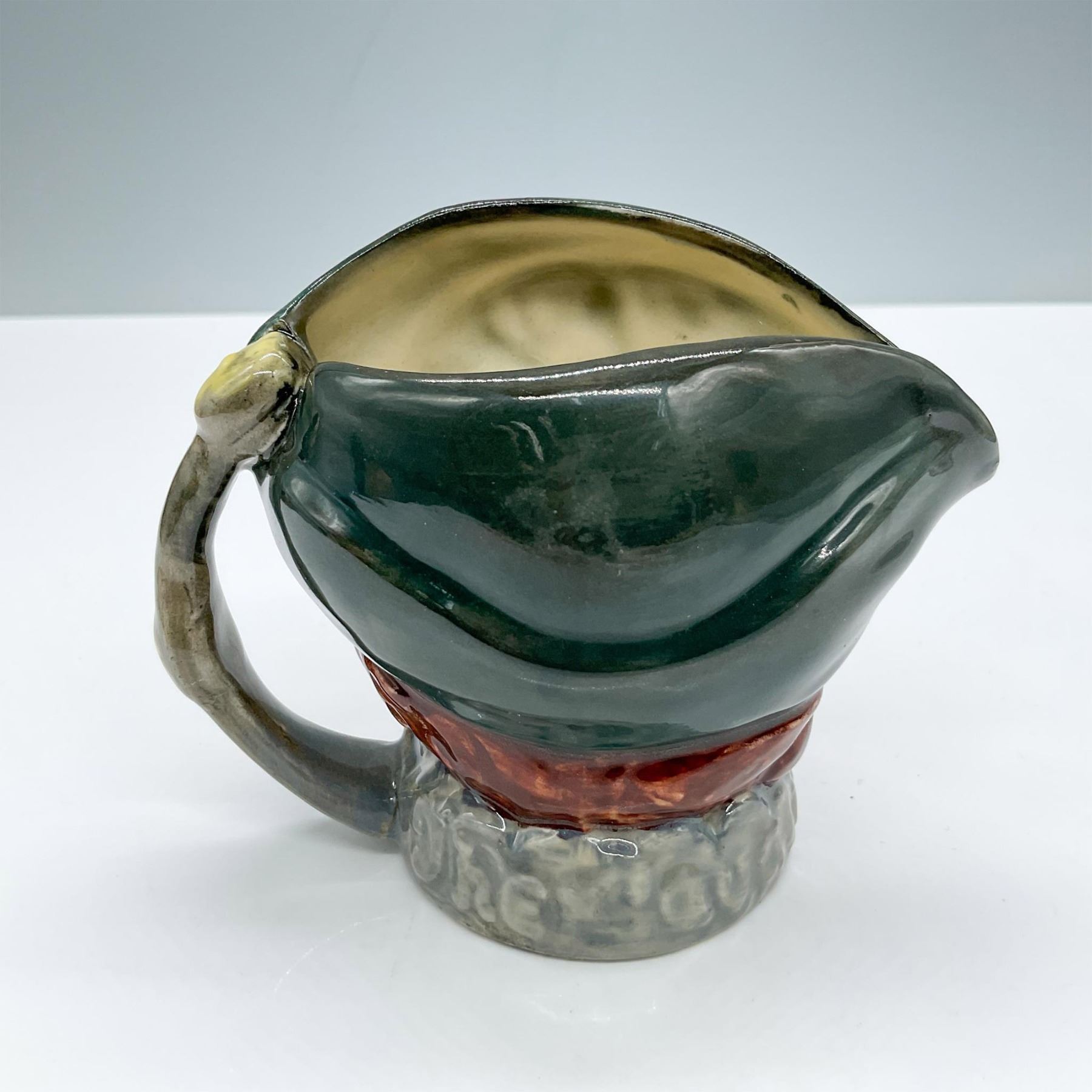 Figural jug of a laughing man in a green hat with a magenta plume and gray ruffled collar. Handle is a handle of sword. Royal Doulton backstamp.