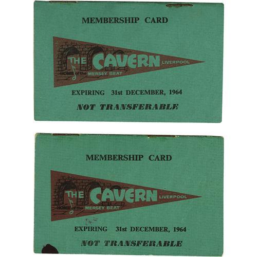 <B>The Cavern Membership Booklet, Group of 2 (1964)</B></I> Beatlemania's "ground zero" was a dark, dank, basement club in Liverpool known as the Cavern, and it was here that the Fab Four began to really make a big splash, after honing their skills in the seedy nightspots of Hamburg. All the "Merseybeat" bands played the Cavern: Gerry and the Pacemakers, the Undertones, the Fourmost, and more; and it was here that a curious Brian Epstein first looked into the band he would manage and direct into world-wide stardom. These two tiny green-covered booklets, one numbered M 10794, the other M 10875, remain in a well-preserved state. The first has a small red ink spot at the edge of the cover, and is signed on the inside by original DJ Bob Wooler and Chris Huston of the Undertakers, while the second has no markings. Both booklets have rust around the staples that has migrated into the interior, and have some light wear along the outer spine area. Average condition is Very Good.