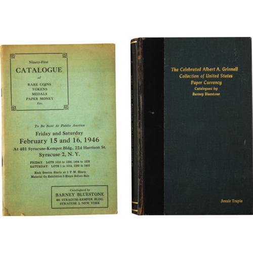 <B>The Celebrated Albert A. Grinnell Collection of United States Paper Currency Catalogued by Barney Bluestone 1944 - 1946 with Prices Realized.</B></I><BR> This was the paper money auction that gave our hobby its "Big Bang," even though the sale of the Grinnell Collection was conducted over a period of two years. There were seven parts, 651 pages, and 5898 lots that realized a total of $250,457. The bound volume catalogue we present here was one of the few that was ordered before the end of the seventh part as it has the former owner's name imprinted on the cover. The former owner had the distinction of typing out all of the descriptions for this famed collection. Also, this example has the autographs of Albert A. Grinnell, Paul E. Draper (Mr. Grinnell's private secretary), and Barney Bluestone on the first flyleaf. There is splitting and chipping along the spine, but nonetheless a great addition to any paper money library. Included in this lot is a February 1946 Barney Bluestone coin auction catalogue that has 102 lots of paper money. <BR><BR><b>Shipping:</b> Coins & Currency (<a target="_blank" href="http://www.heritageauctions.com/common/shipping.php">view shipping information</a>)