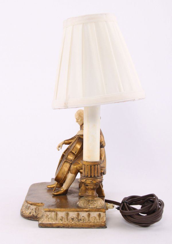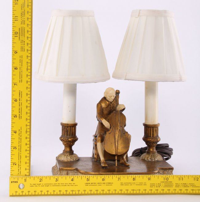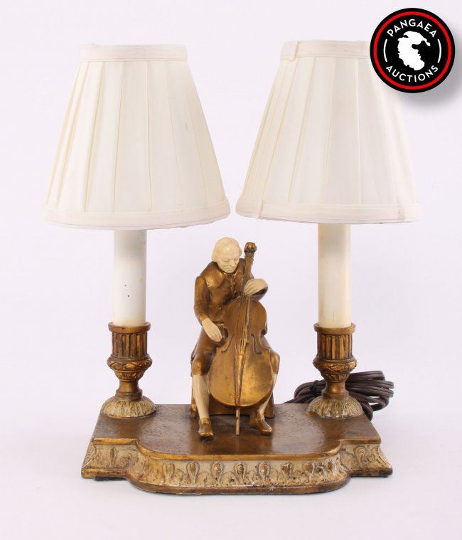 The Cellist lamp by John Ruhl for the J.B. Hirsch Foundry circa 1932. Bronze finish metal figure with celluloid head. John Ruhl, Sculptor. Metal torso with celluloid head and marble base. SIZE: see attached ruler photo. Photos are part of the description representing the condition report and can be used for authentication prior to the auction date. Pangaea Auctions urges Bidder's to view all attached photos in detail. #(American, 19th-20th Century, Decorative Art, Lamp, Composite, , )
