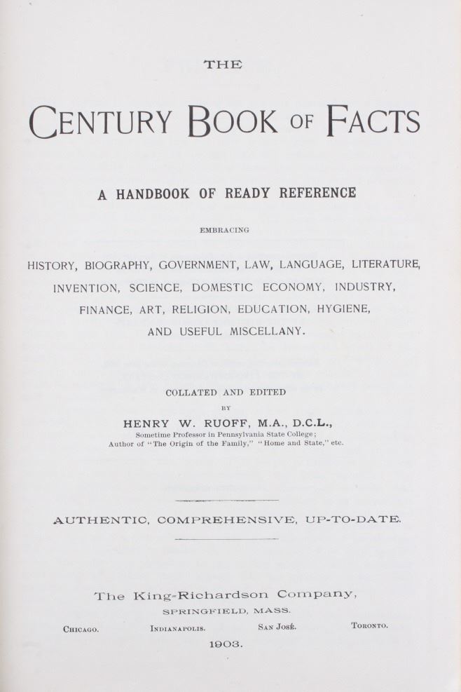 For your consideration is this 1903 “The Century Book of Facts” by Henry Ruoff. This book is a handbook of ready reference embracing history, biography, government, law, language, literature, invention, science, domestic economy, industry, finance, art, religion, education, hygiene, and useful miscellany. The condition of this book is good, with no obvious signs of damage and wear consistent with age and usage. The measurements of this book of facts are 9 1/2" x 7".