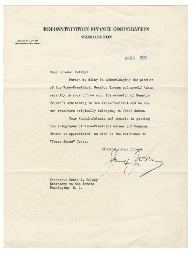 Jesse H. Jones (1874 – 1956). Businessman. Served as head of the Reconstruction Finance Corporation, the federal agency which was originally created by Herbert Hoover to provide financial support for industrial growth and expansion during the Great Depression and, later, during World War II. TLS. 1 page. April 6, 1938. Washington, D.C. Jones writes to Senate Secretary Edwin A. Halsey; “Pardon my delay in acknowledging the picture of the Vice-President, Senator Truman and myself taken recently in your office upon the occasion of Senator Truman’s exhibiting to the Vice-President and me the two revolvers originally belonging to Jesse James. Your thoughtfulness and trouble in getting the autographs of Vice-President Garner and Senator Truman is appreciated, as also is the reference to “Jesse James” Jones. Sincerely your friend, Jesse H. Jones” A fine association and interesting content.
