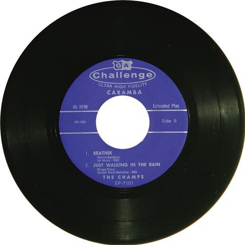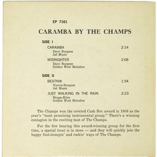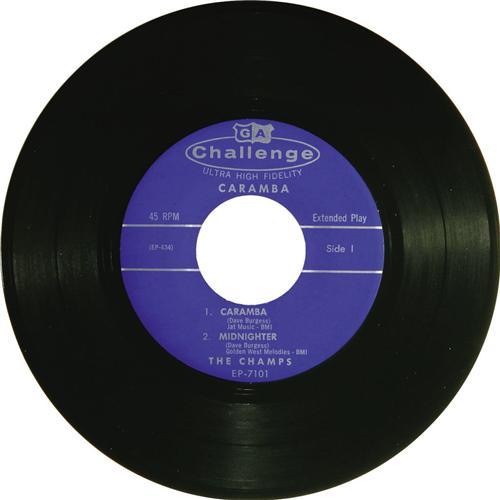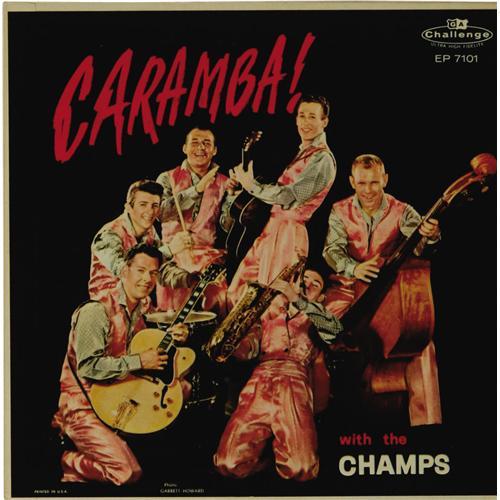 <B>The Champs "Caramba!" EP Challenge 7101 (1958).</B></I> One of the '50s greatest instrumental bands released two EPs in 1958, their magical "Tequila" year. This is the second, and what a beauty! Cuts include "Caramba", "Midnighter", "Beatnik", and "Just Walking In The Rain". Condition: NM 8/ GM-MT 10 <I>From the GRT Collection</B></I>.