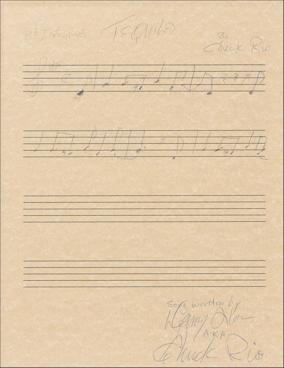 AMQS on an off-white 8.5 x 11 musically-lined sheet. Rio pens six bars of music from the Champs 1958 classic ‘Tequila.’ Signed at the bottom, “Song written by Danny Flores AKA Chuck Rio,” who has also signed at the top along with the song title. In fine condition.