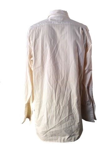 Joseph (Geza Rohrig) screen worn, hero, white "Darcy" with brown stripes work shirt.