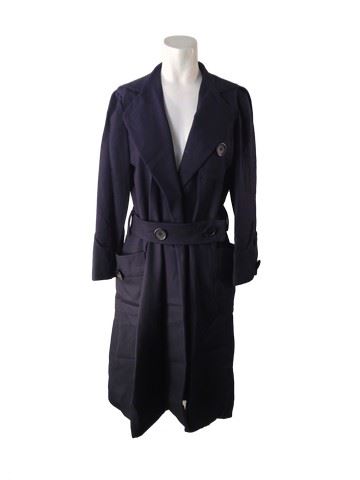 Louise Brooks (Haley Lu Richardson) screen worn, hero, navy cotton coat with large v-neck top and a belt with 3 large buttons, the lining is an iridescent blue and purple.