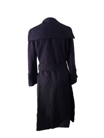 Louise Brooks (Haley Lu Richardson) screen worn, hero, navy cotton coat with large v-neck top and a belt with 3 large buttons, the lining is an iridescent blue and purple.