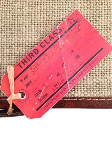 Louise Brooks (Haley Lu Richardson) screen used, hero, tan and brown trim luggage, third class ticket from 'Penn Station" on the handle, the luggage has a mat inside that is from Italy.(17x13x7)