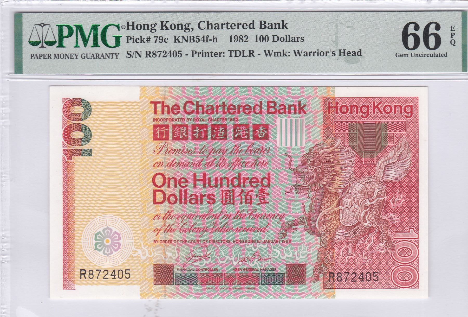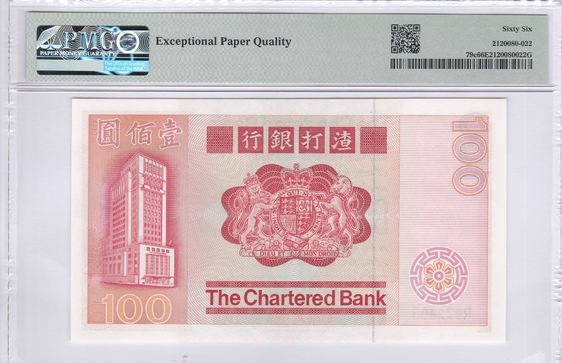 1982, 渣打銀行, $100, 編號: R872405, PMG 66EPQ.