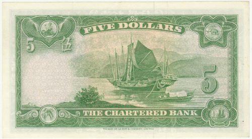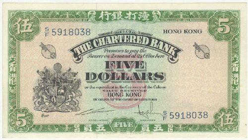 Hong Kong, The Chartered Bank, 5 dollars, issue 1961-67 ND, EF, serial S/F5918038. Pick number 68.