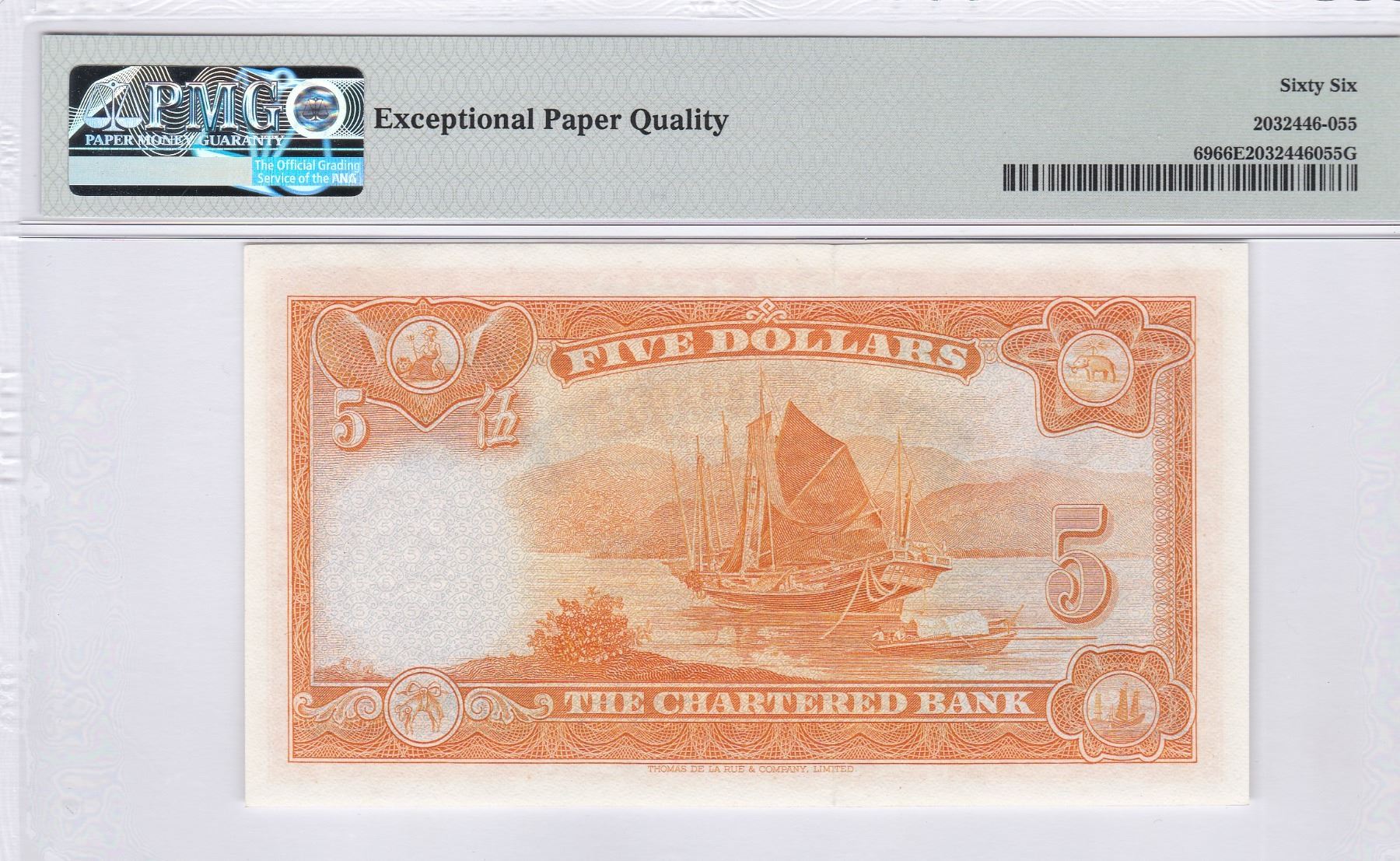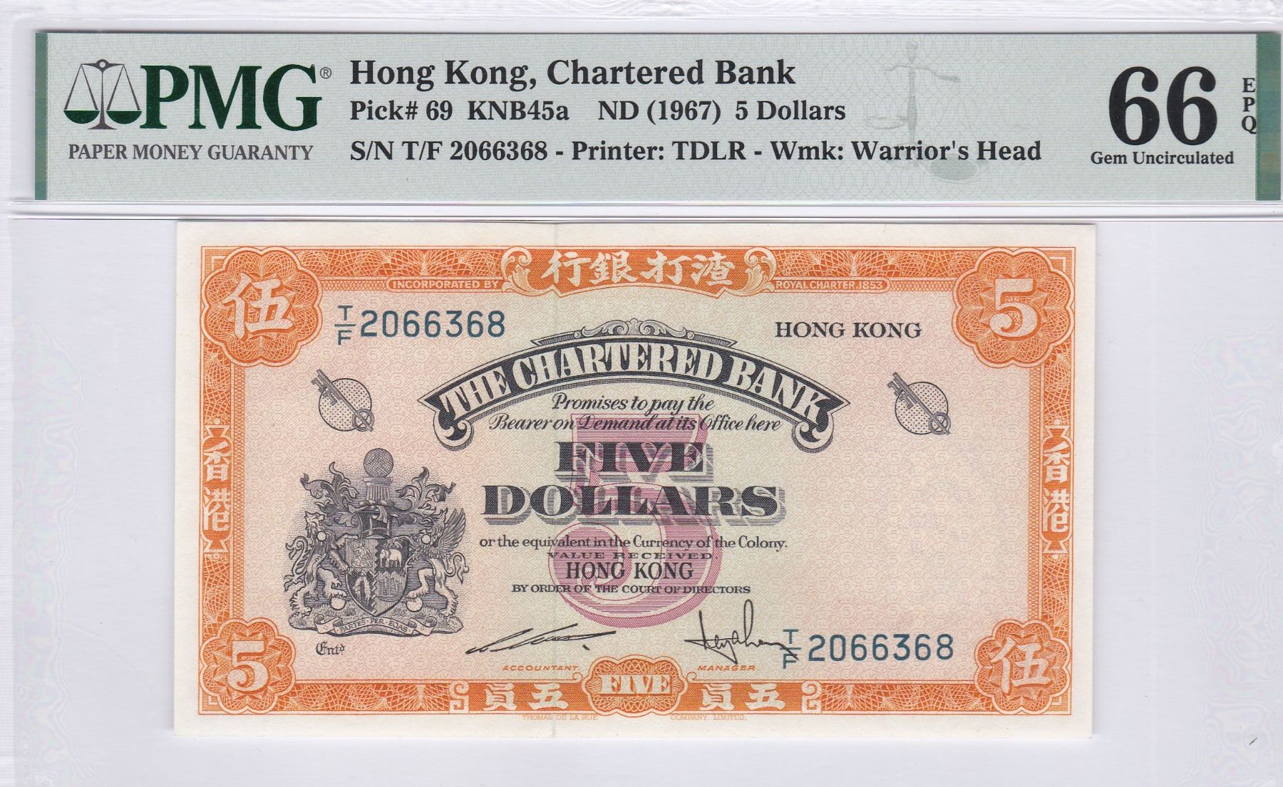 ND (1967), 渣打銀行, $5, 編號: T/F 2066368 PMG 66EPQ. (無47, 8 尾)