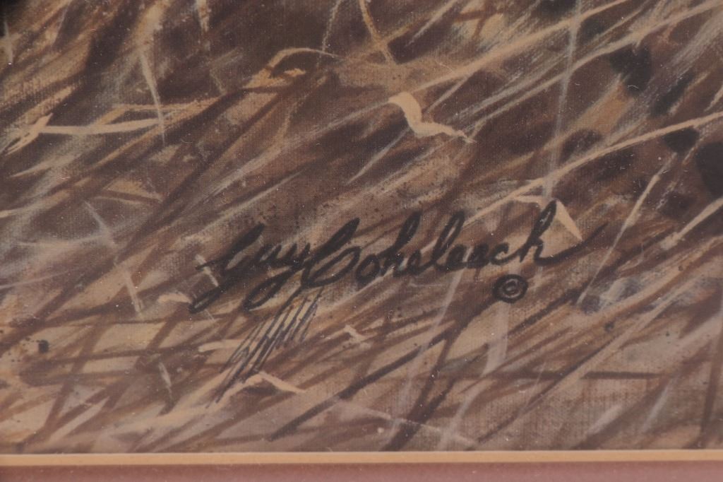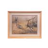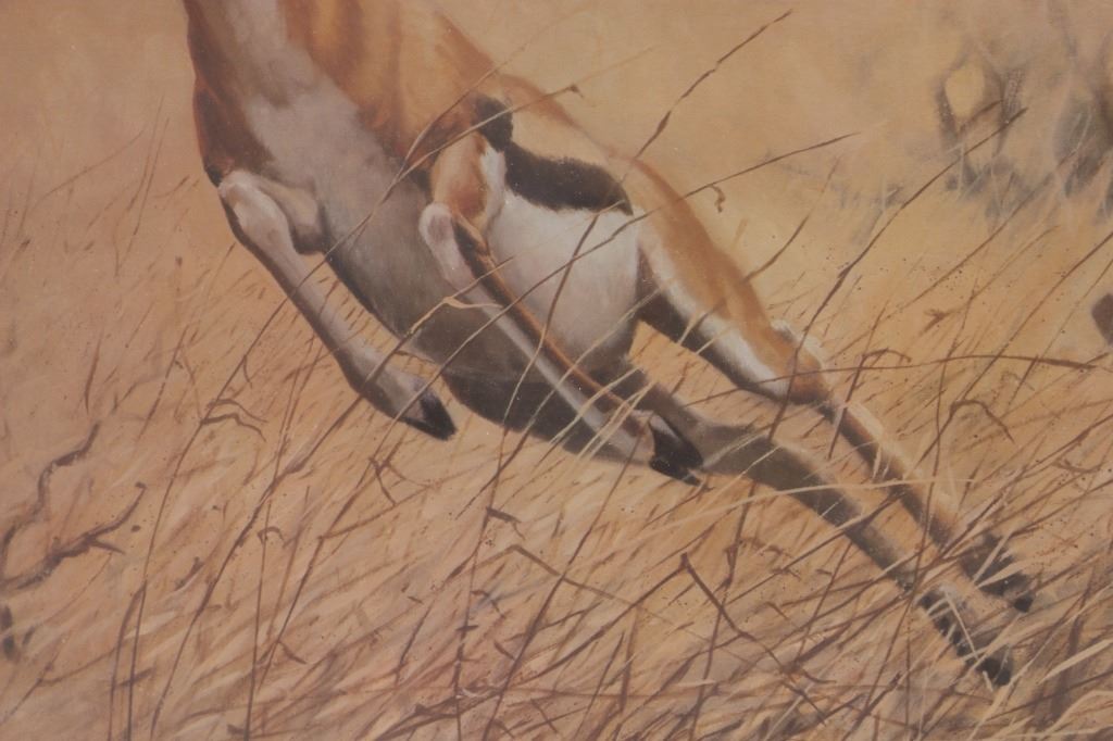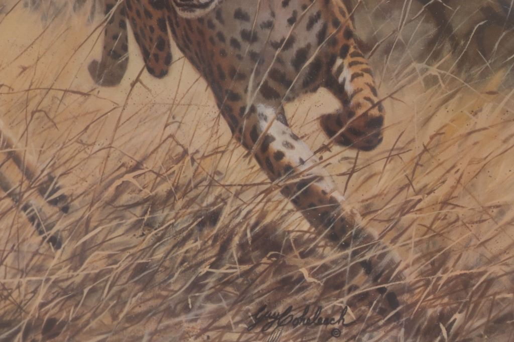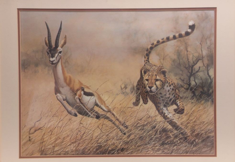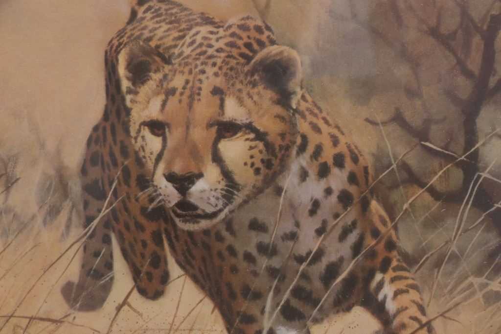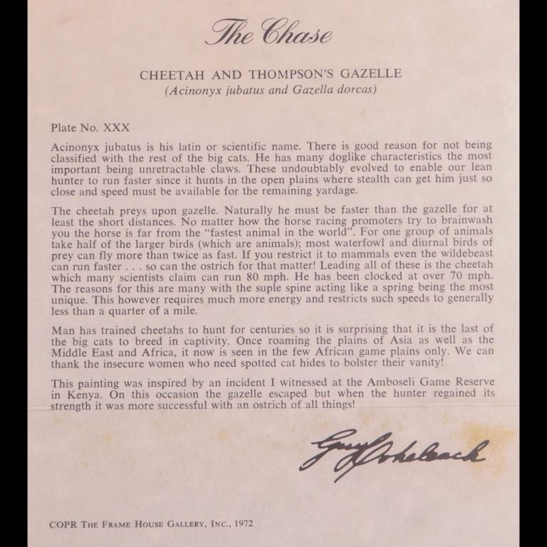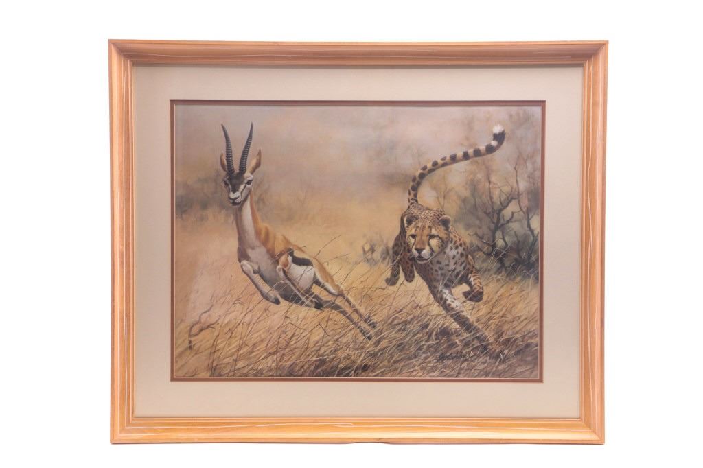 Featured in this lot is a Cheetah hunt framed print by Guy Coheleach titled "The Chase". Guy Coheleach (1933- current) is an American wildlife artist known for his depictions of African wild life. Coheleach's art has been displayed in galleries across the Nation, including The Corcoran Gallery, The White House, The Royal Ontario Museum, and the National Collection of Fine Art. This painting depicts a Cheetah mid chase with a Thomson's gazelle across the grass of the savanna. This scene shows the cheetah running at full speed as the gazelle leaps out of harm’s way. The piece is signed in the bottom right hand corner, reading "Guy Coheleach". The print is set into a wooden frame with a cream colored border around the piece. The art comes with a biography and information on Guy Coheleach from the Frame House Gallery. The piece shows good condition overall, with some light wear across the frame. The frame measures 29 1/2" wide by 24" tall, with the art measuring 22" wide by 16 1/2" tall.