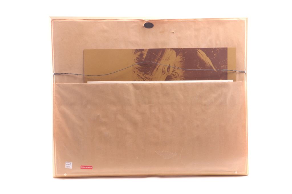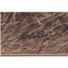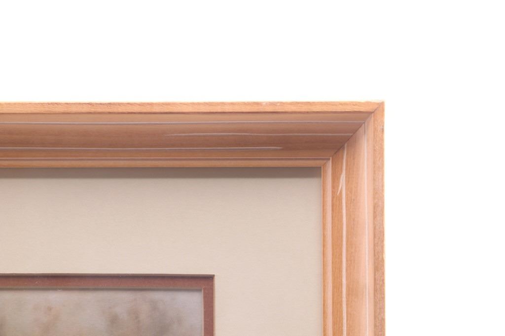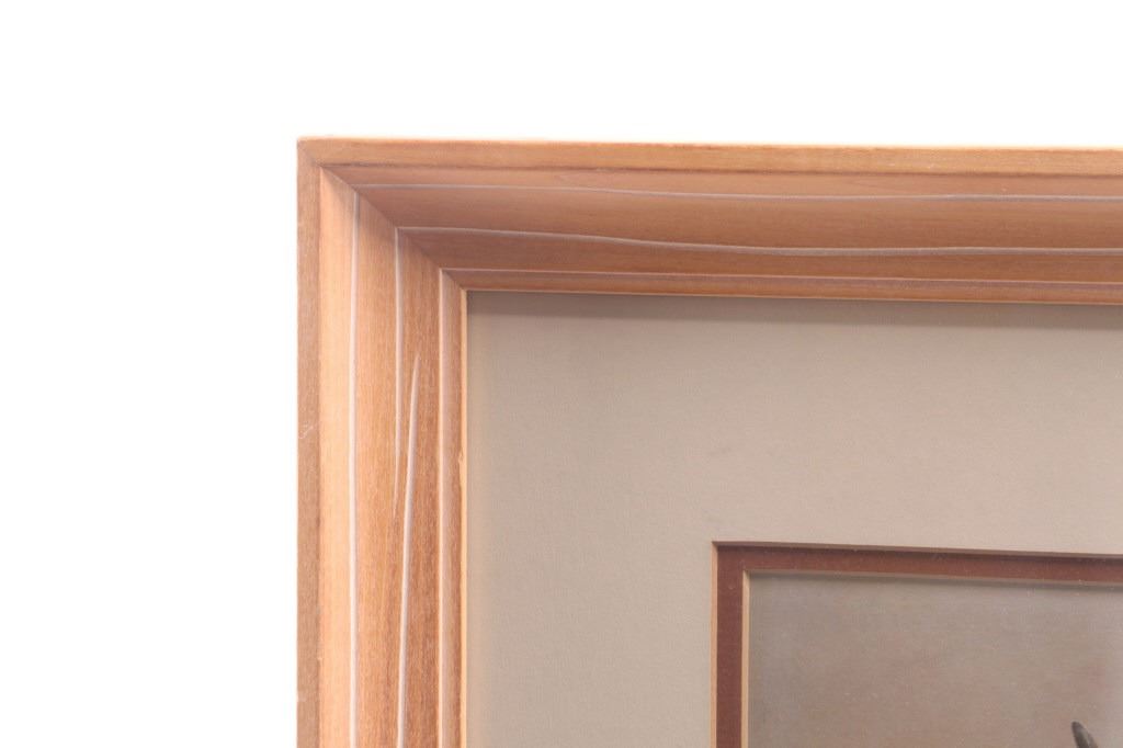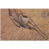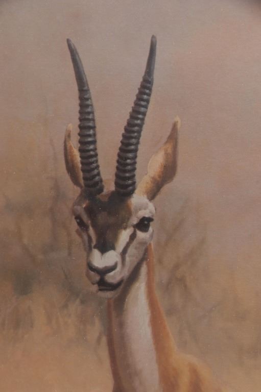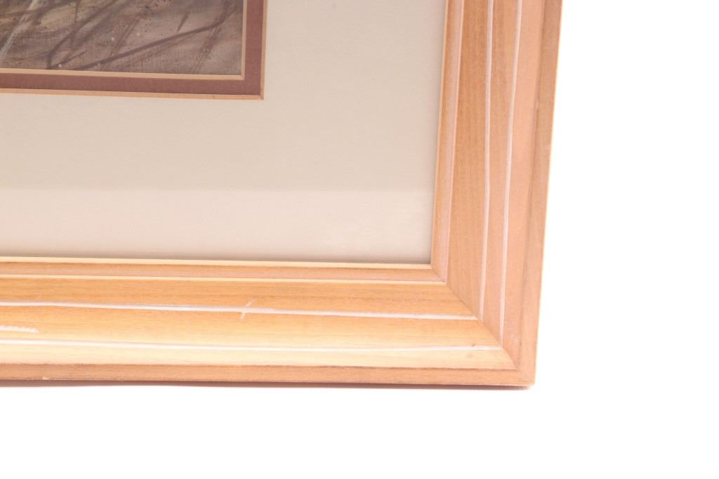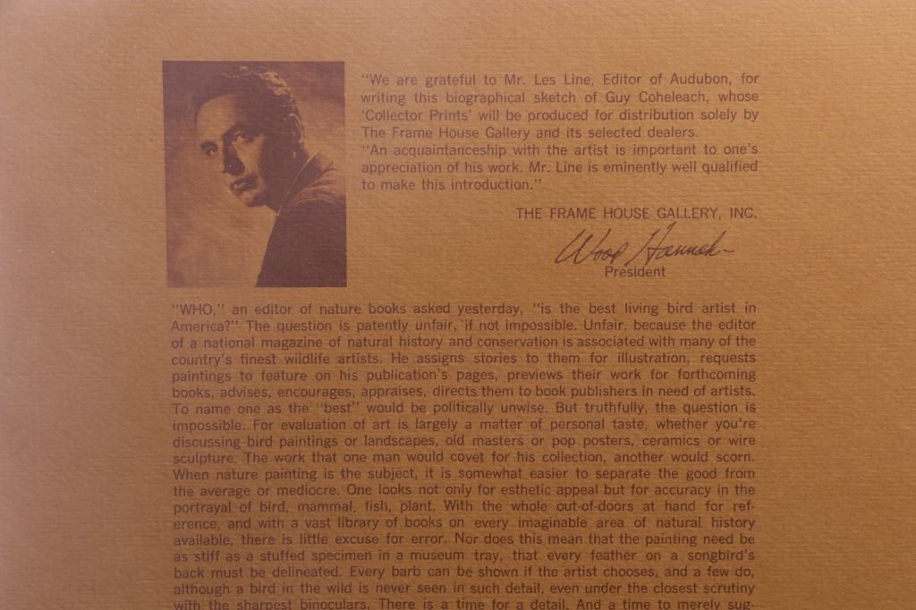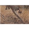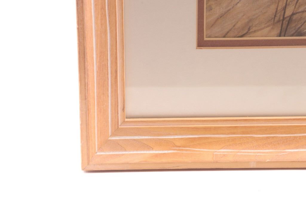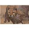 Featured in this lot is a Cheetah hunt framed print by Guy Coheleach titled "The Chase". Guy Coheleach (1933- current) is an American wildlife artist known for his depictions of African wild life. Coheleach's art has been displayed in galleries across the Nation, including The Corcoran Gallery, The White House, The Royal Ontario Museum, and the National Collection of Fine Art. This painting depicts a Cheetah mid chase with a Thomson's gazelle across the grass of the savanna. This scene shows the cheetah running at full speed as the gazelle leaps out of harm’s way. The piece is signed in the bottom right hand corner, reading "Guy Coheleach". The print is set into a wooden frame with a cream colored border around the piece. The art comes with a biography and information on Guy Coheleach from the Frame House Gallery. The piece shows good condition overall, with some light wear across the frame. The frame measures 29 1/2" wide by 24" tall, with the art measuring 22" wide by 16 1/2" tall.