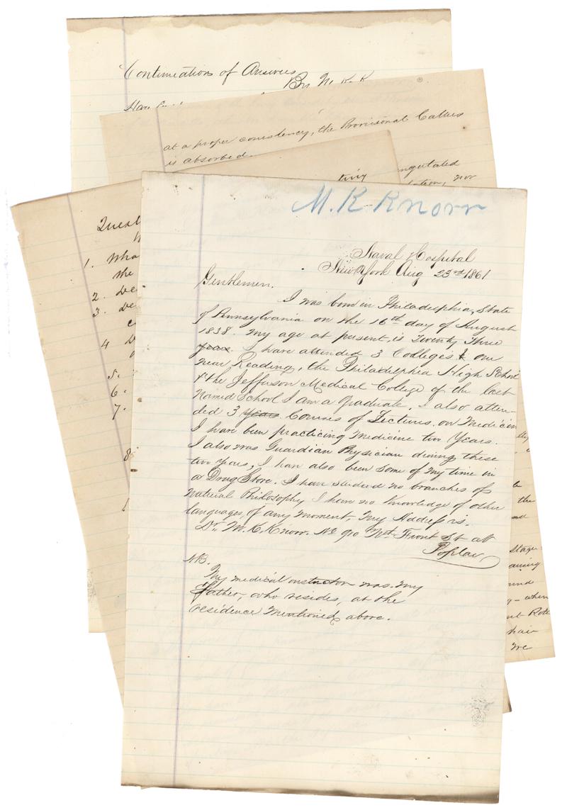 Application submitted to the Naval Examining Board for a position as Assistant Surgeon. 4 pages. Naval Hospital, New York. August 23, 1861. Knorr provided answers to 8 questions concerning subjects such as “the chemical formation of chloroform and dangers from its use” and the therapeutic effects of Digitalis”. Fine medical content.