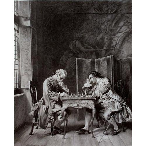 Extraordinary etching The Chess Players engraved by Jules Jacquet after the painting by leading French academic painter Jean-Louis Ernest Meissonier (1815-1891). The text reads as follows: London, Published January 8, 1900, by L. H. Lefevre and Son, 1a. King Street, St. James S. W., Printed in Paris by A. Porcabeuf. The signature Meissonnier and year 1837 appear on the plate consistent with the year when the painting was exhibited in the Paris Salon. It is signed on the lower left Jules Jacquet and bears tiny initials HC on the left of the signature which stand for Hors d'Commerce, a French term for prints from an edition intended to be used as samples to show to dealers and galleries. In good used condition with minor signs of wear as shown. Please ask questions, request additional photos and shipping costs before buying.