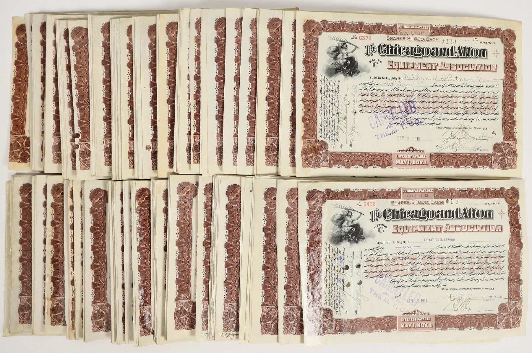 Over 150+. Mostly I.C. Issued 1906-14. VG or better. The Chicago and Alton Equipment Assoc.
