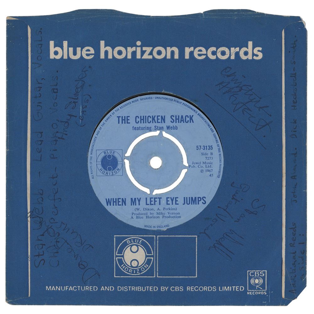 Blue Horizon Records 45 RPM single record for 'It's Okay With Me Baby / When My Left Eye Jumps,' released in early 1968, signed on the sleeve in ink, "Christine A. Perfect" (later Fleetwood Mac's Chrstine McVie), "Stan Webb, Guitar/Vocals," "Dave Bidwell, Drums," and "Andy Silvester, (Bass)." The sleeve also has a few annotations noting the members (impinging on the Bidwell and Silverster signatures), and the group's name written in bubble letters on the opposite side. In very good to fine condition, with light edge creasing, and moderate signature contrast. The record is included. A rare, super early autograph of Christine McVie using her maiden name; she married John McVie in 1968, and joined Fleetwood Mac in 1970.