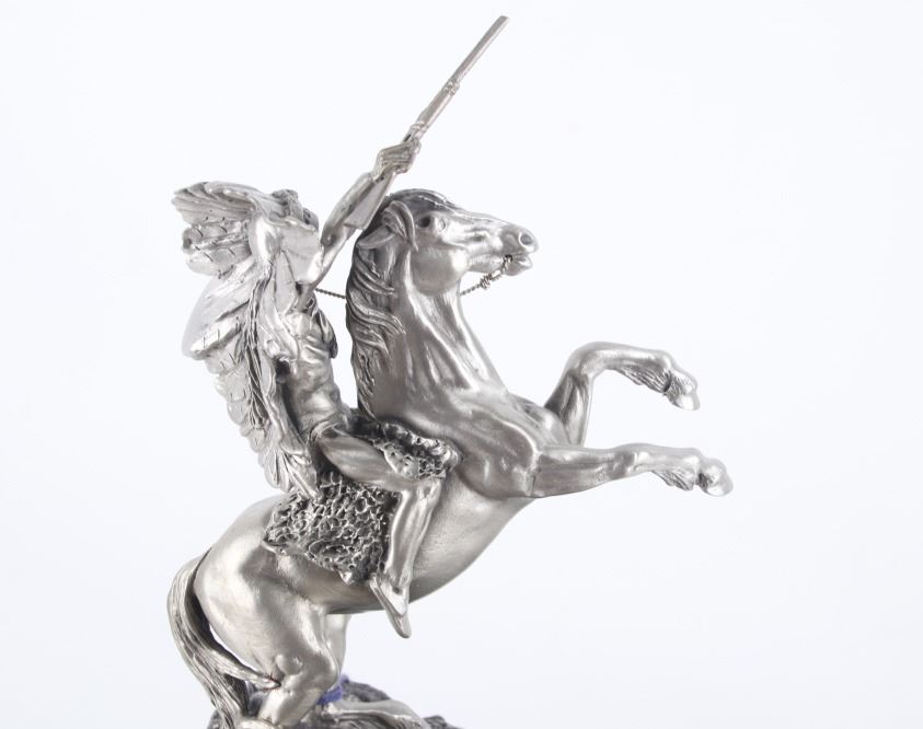 This is a Don Polland limited edition pewter sculpture titled "The Chief". It is a beautifully created figurine depicting a Native American chief rearing back on a horse while on a rocky outcrop; the chief’s left hand holds a shield, and his right hand extends a clasped rifle. His war bonnet shows multi-layered feathers. The chief is sitting on a hide blanket reminiscent of American bison, colloquially known as buffalo. The solid wood base has very slight scratches, most likely from normal handling. The pewter is in very fine condition. The piece measures 5.75" L x 5.5" W x 7.75" H.