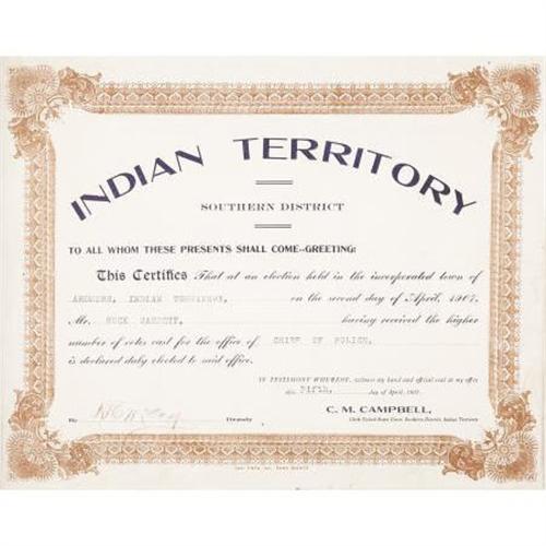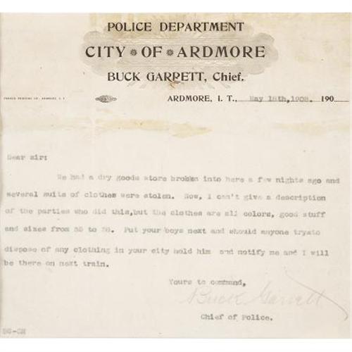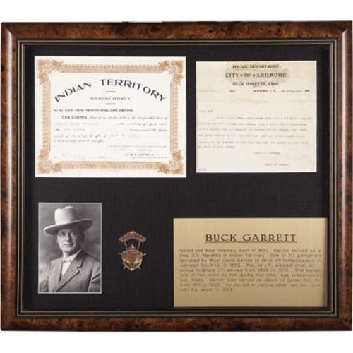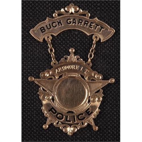 <B>THE CHIEF OF POLICE BADGE WORN BY BUCK GARRETT, ARDMORE, INDIAN TERRITORY</B></I> - Buck Garrett was a noted lawman and gunfighter in the West. A sometimes policeman, other times gunfighter hired out by the cattle barons to drive off homesteaders in Wyoming, Garrett served as a deputy marshall in the Indian Territory and was later elected to the position of Chief of Police at Ardmore, Indian Territory from 1905 to 1910.<BR><BR>This badge is from the era in which Garrett served as Chief of Police at Ardmore. Presented to him by O. A. Wells, the two-piece gold badge has Garrett's name on the upper device with 'Ardmore, I.T.' on a banner within a star above 'Police'. The badge comes as a set with his election certificate, a police report of a theft signed by Garrett and a photograph of Chief Garrett. A placard with Garrett's biography is also placed within a burlwood frame with the badge and other materials.<I> From The George Jackson Collection.</B></I><BR><BR><B>Condition:</B></I> Excellent condition with minor wear to original finish, with original clasp.<BR><BR><b>Shipping:</b> Framed - with Glass, Medium (<a target="_blank" href="http://www.heritageauctions.com/common/shipping.php">view shipping information</a>)