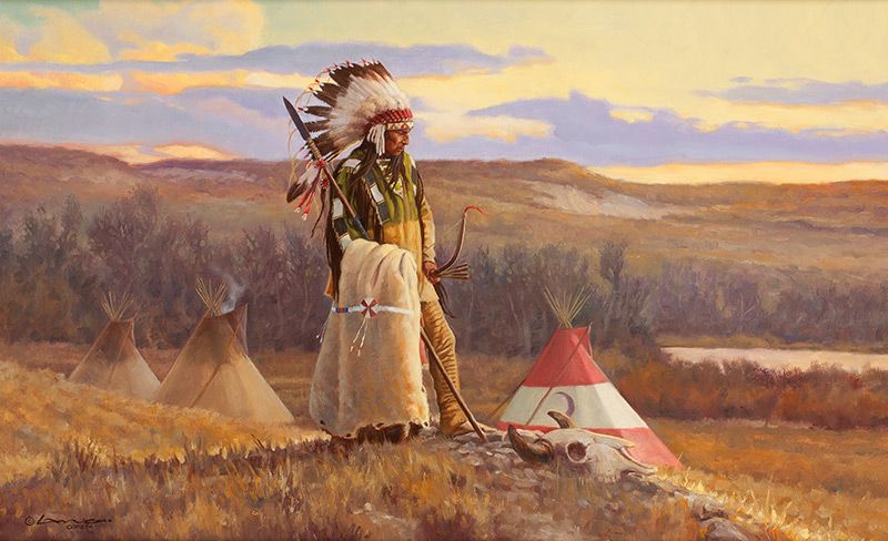 "The Native People’s way of life was dramatically altered after the arrival of European civilization to the North American continent. With the tragic and inevitable conclusion of the Great Sioux War in the 1870’s, the last stand of the free roaming Plains Indians came to an end. This Cheyenne Chief stands on a hill overlooking his small camp, lamenting on the nature of life and the destiny of his people in the years to come. The hopes and dreams of his people to continue living wild and free is a concept that is setting like the sun. What tomorrow may bring, only the Great