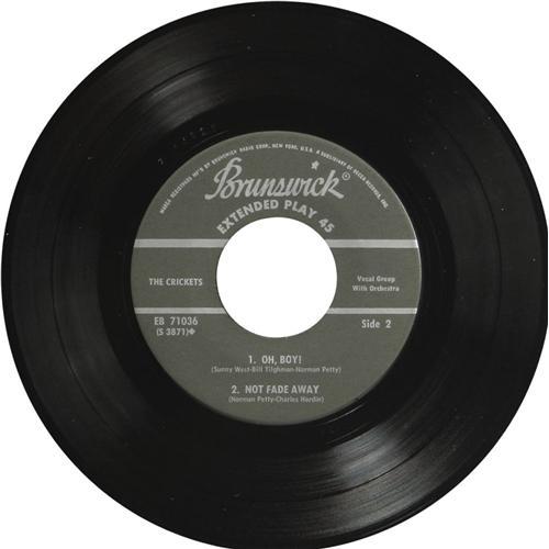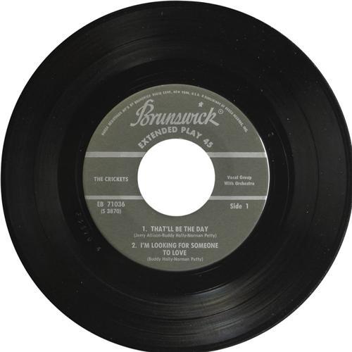 <B>"The 'Chirping' Crickets" Blank Back Cover EP Brunswick 71036 (1957).</B></I> This version is rarer than the one with a printed back. It's the first EP by the group, excerpted from the classic first album of the same name. Included songs are the hits "That'll Be the Day," "Oh, Boy!," and "Not Fade Away," plus the oft-overlooked rockin' gem, "I'm Looking For Someone To Love." Beautiful copy of a rare record. Condition: NM 8/ MT 9. <I>From the GRT Collection</B></I>