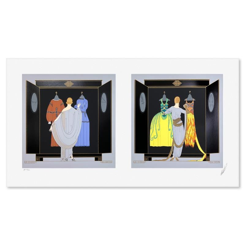 "The Choice" is a limited edition serigraph on paper by Erte (1892-1990), AP numbered 43/60 and hand signed by the artist. Includes Letter of Authenticity. Measures approx. 20.5" x 37.5" (border), 15" x 32.5" (image).
