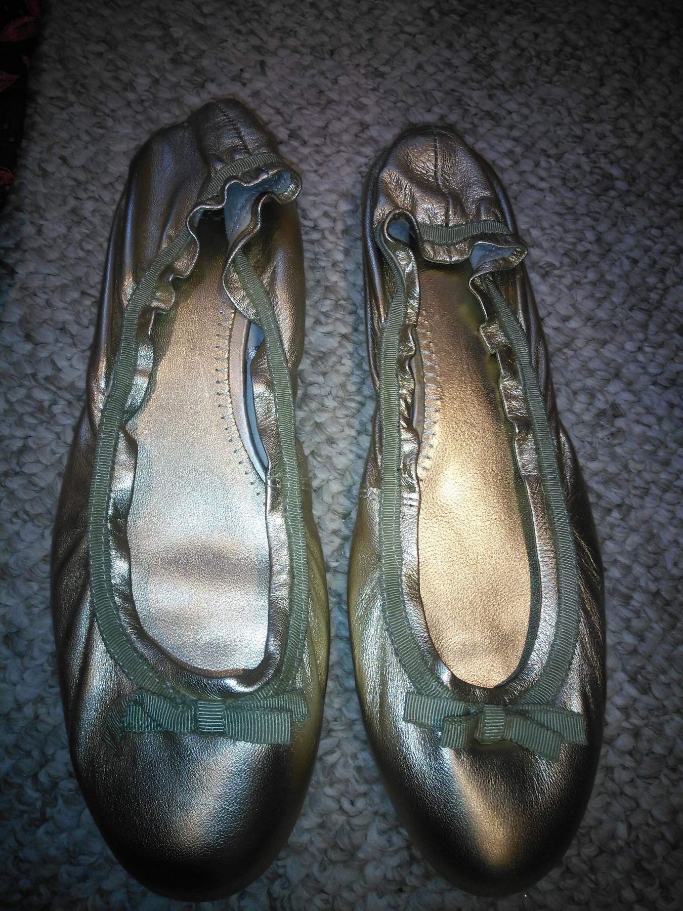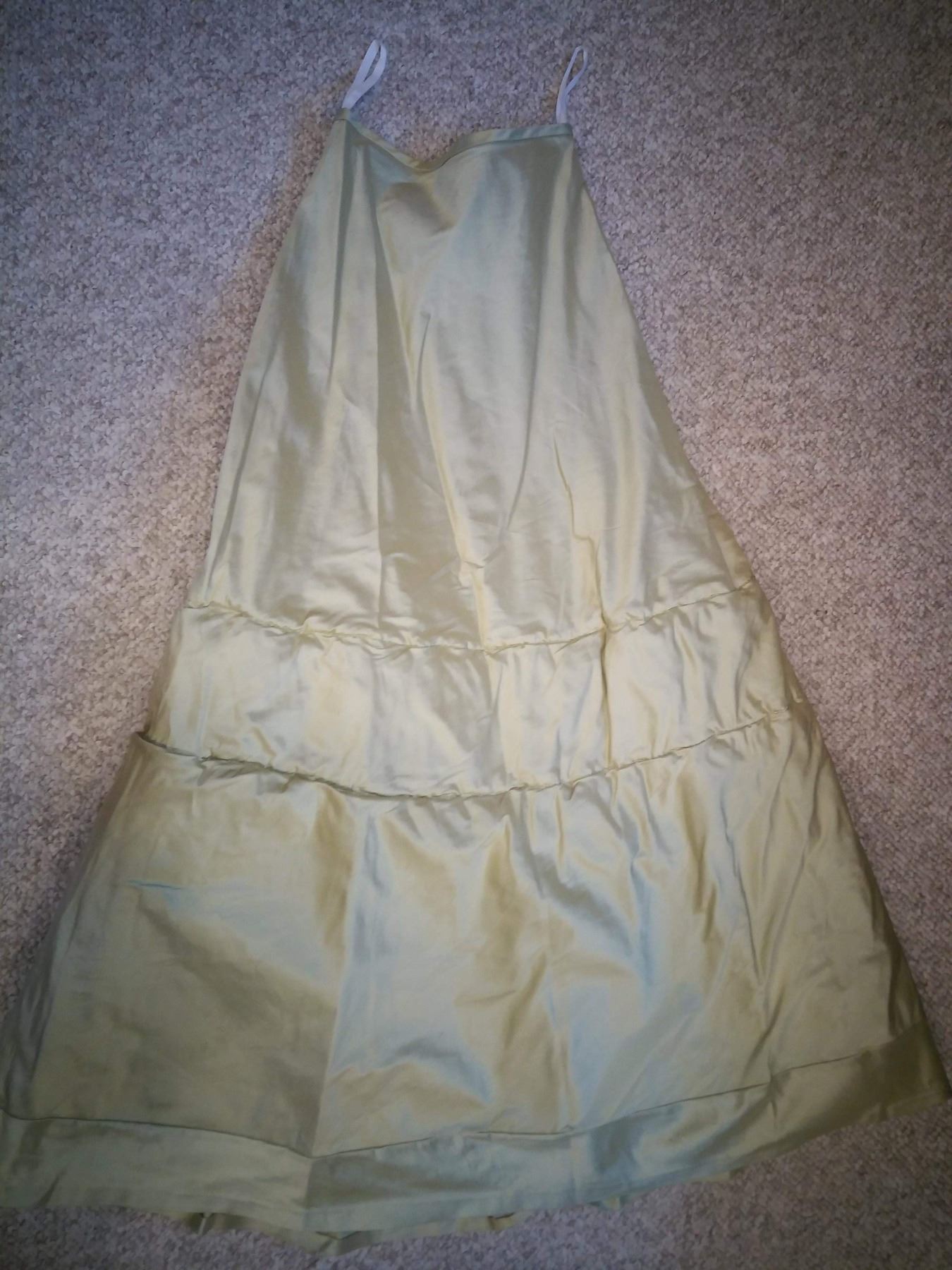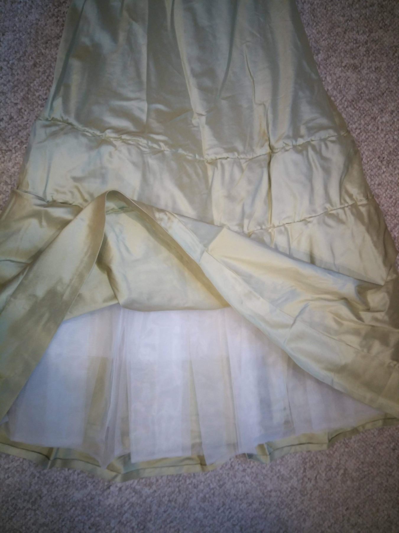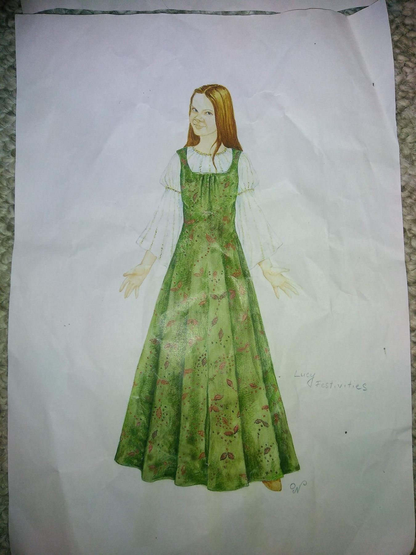 Lucy's double Final passage scene Dress. Made by Isis mussenden, the Apple Green and Pink detail embroidered dress. Also has included a pink underdress and golden ballerina shoes with costume tags and and a printed reference sketch.