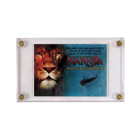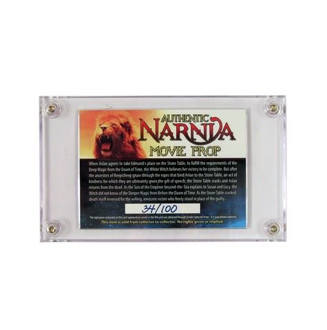 From The Chronicles of Narnia: The Lion, the Witch and the Wardrobe (2005), this is a piece of the screen used strand of rope used to bind Aslan to the Stone Table and thereby fulfill the Deep Magic requirements from the Dawn of Time. Collector's item numbered 34 of 100, Aslan's rope comes with a commemorative card showing the lion and sealed in a thick plastic case. Also included are 14 color photographs (3" x 5") of the film's production: lead cast members filming scenes, cast and crew on the set, props and set decoration, and filming equipment such as lights, cameras, booms, and screens.