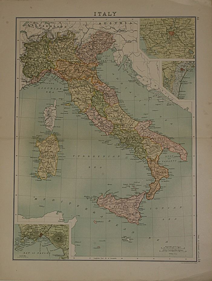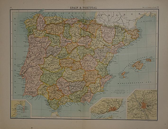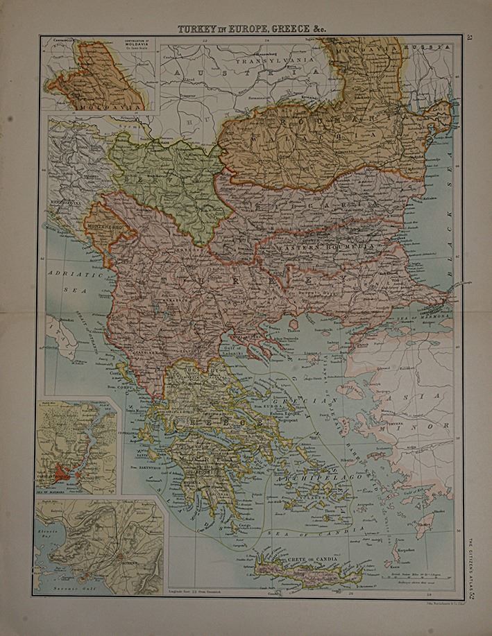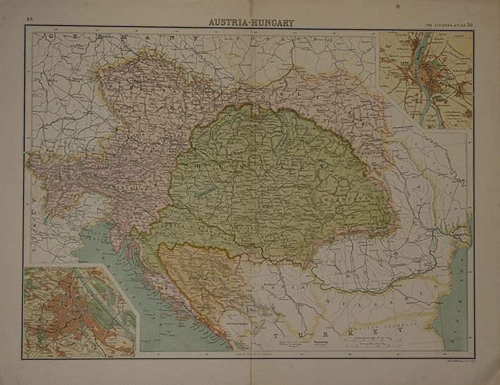 The Citizen's Atlas, World maps, Europe, the first Austria - Hungary, the second Italy, the third Spain & Portugal, the fourth Turkey in Europe, Greece & c, lightly aged, few with edge nicks, no damage to map surfaces, map size 31x41cm, by J. G. Bartholomew & George Newnes, London, 1898 (4 maps)