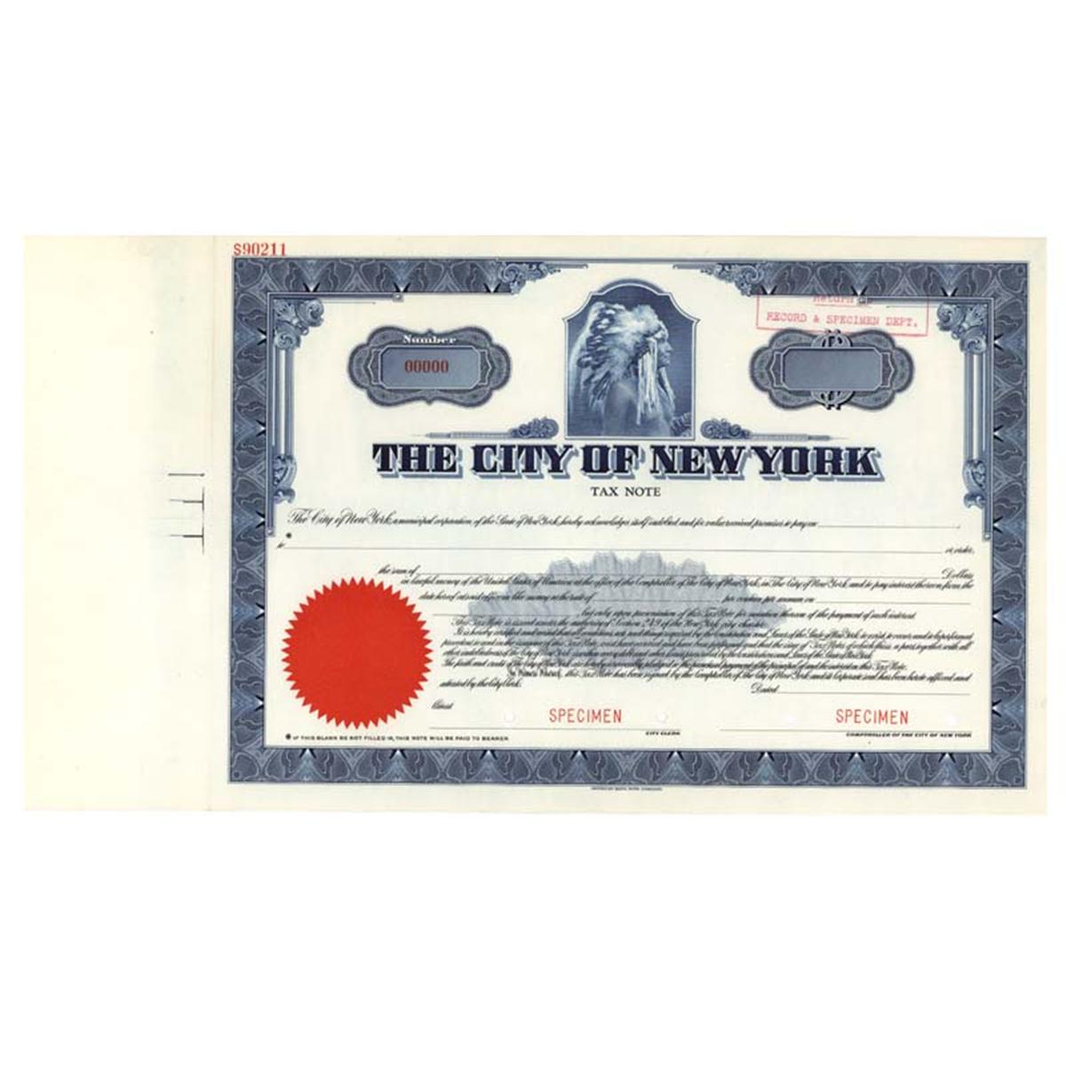 SPECIMEN. No date, New York. Specimen #00000 The City of New York Tax Note. Blue / Black. Vignette of a Native American at top center “Return to Records & Specimen Dept.” stamp at upper right. Punch cancelled and Very Fine