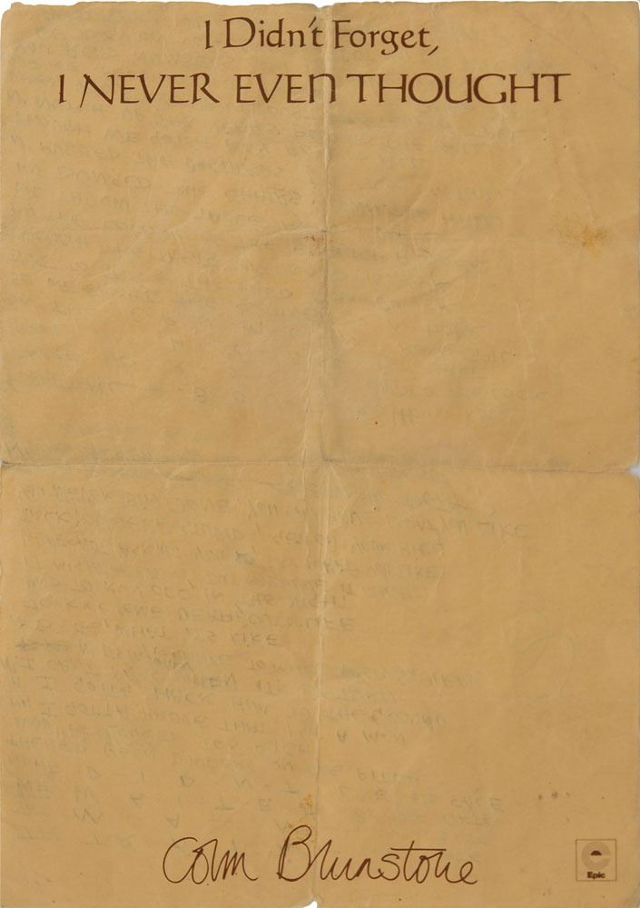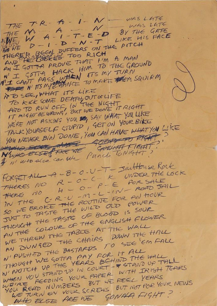 Joe Strummer's handwritten lyrics to an unpublished song, one page, 5.75 x 8.25, no date, penned in blue ballpoint on the reverse of Colin Blunstone's personal letterhead. The untitled lyrics, in part: "The T-R-A-I-N-was late / the M-A-N-was late / we W-A-I-T-E-D by the gate / you know we D-I-D-N-T like his face / there'd been duffers on the pitch / and this geezer he looked too rich / an I gotta prove that I'm a man / n' I gotta hack him to the ground / n' I can't pass when it's my turn / n' it's my only chance to make 'em squirm / n' to see, what it's like / to kick some death, out of life / and to run off, in the night / it might be wrong, but we done it right / we're not asking you, say what you like / talk yourself stupid, get on your bike / you never bin done, you can have what you like / n' who else can we punch tonight." In very good to fine condition, with light stains, intersecting folds, and general handling wear. Pre-certified REAL.