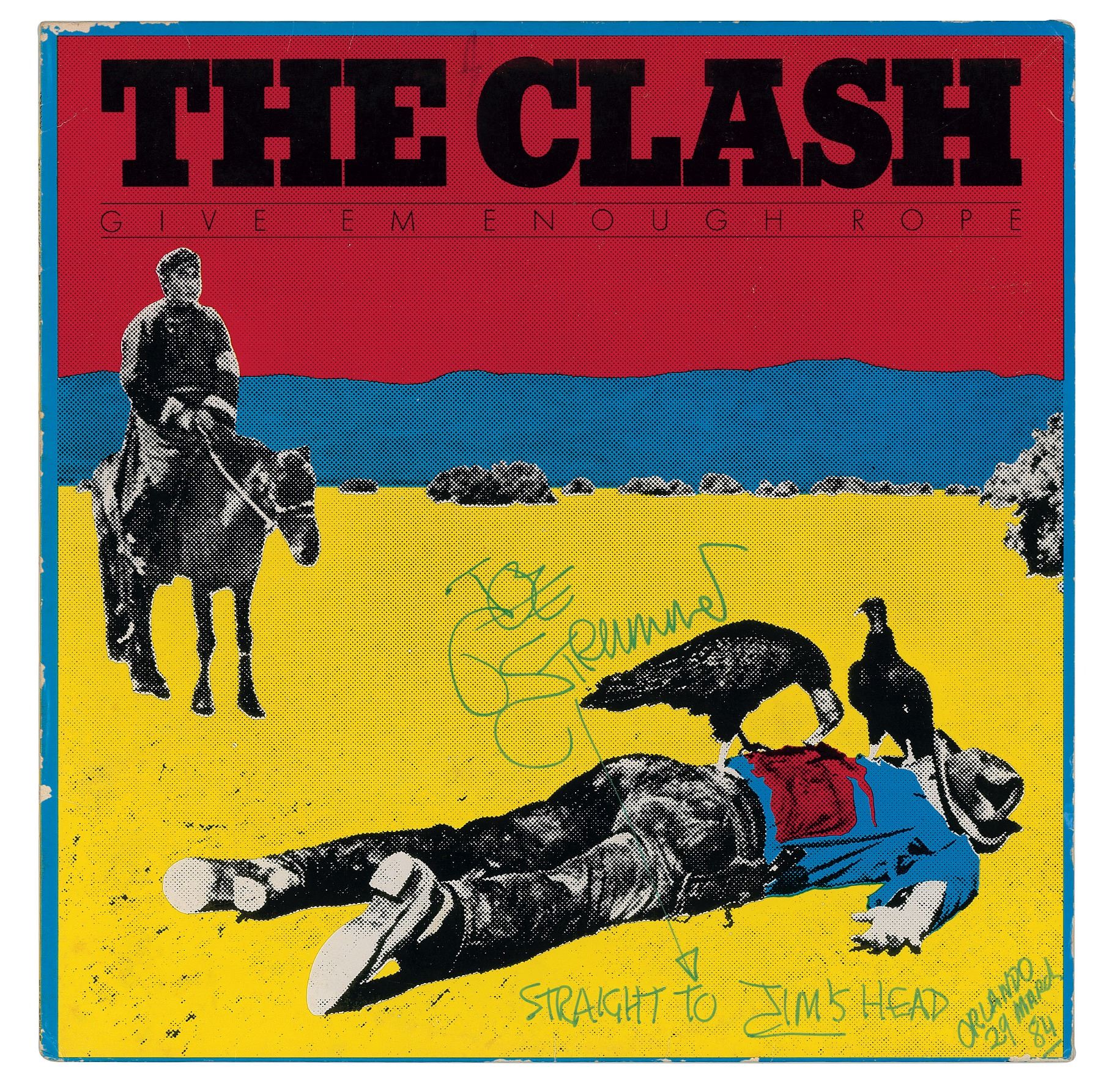 Give 'Em Enough Rope album signed and inscribed on the front cover in green felt tip, "Joe Strummer," who adds below, "Straight to Jim's head, Orlando, 29 March 84." In fine condition, with light edge wear. The record is not included.