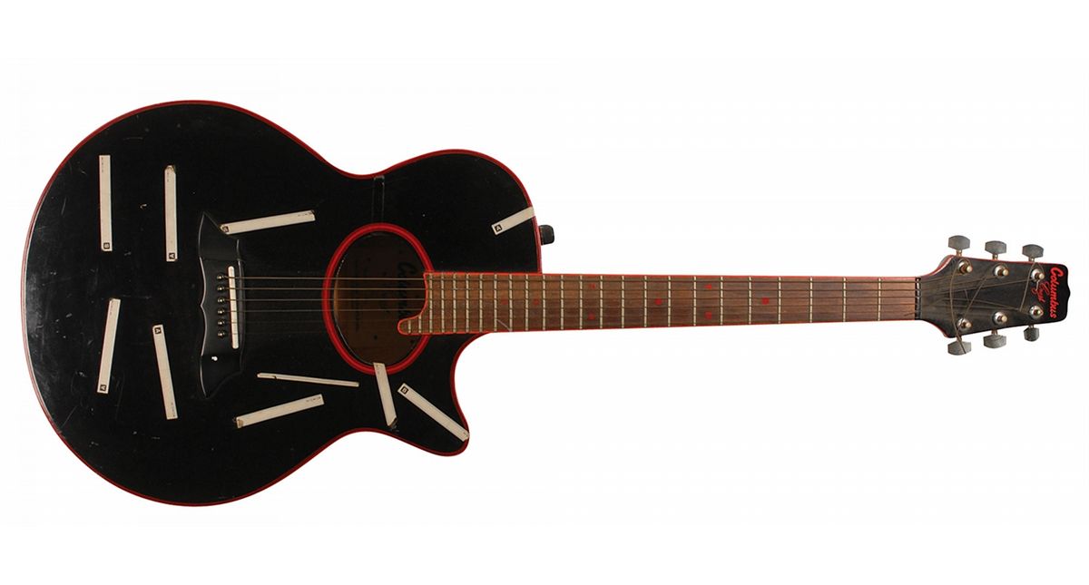 Black-bodied Columbus Crest Model 59/A six-string acoustic guitar, owned and used by Strummer. This guitar was used during the making of Earthquake Weather, Strummer's only studio album with The Latino Rockabilly War. The guitar was given to Strummer by a friend during a recording session in Los Angeles. Strummer was not in the habit of travelling with his instruments, and would use whatever was available. At that time, Strummer added several audio cassette labels to the body in a random pattern in his attempt to make the guitar look like a version of one of Eddie Van Halen’s ‘Frankenstein’ electric guitars. Later on, he presented the guitar to the band’s former manager Gerry Harrington. In fine condition, with expected wear from use. An ordinary guitar transformed into an extraordinary piece of rock and roll history by one of the iconic figures of the British punk movement.