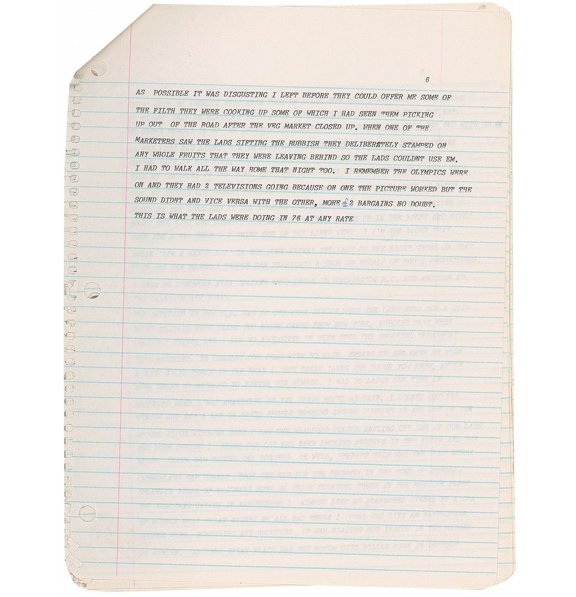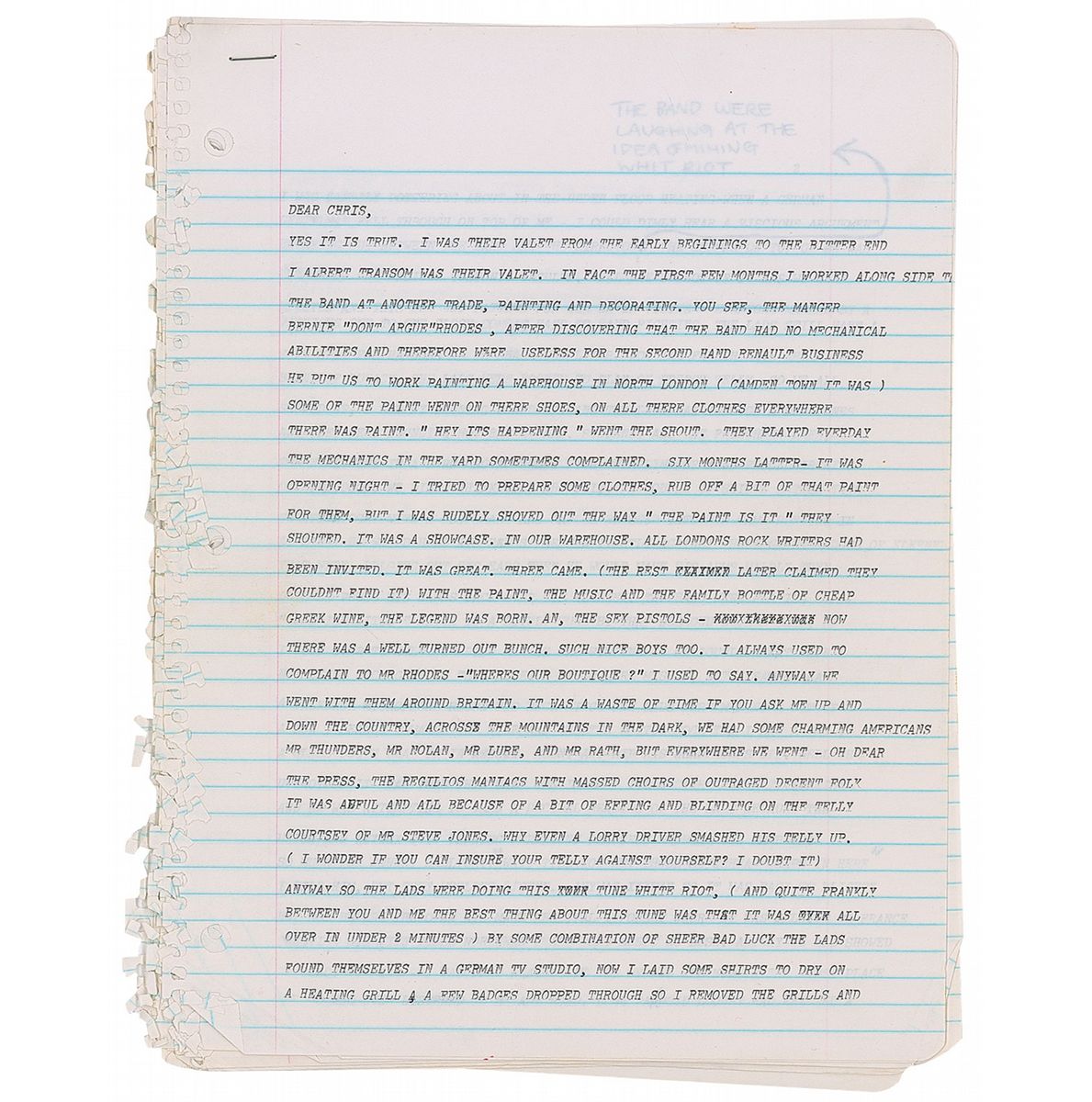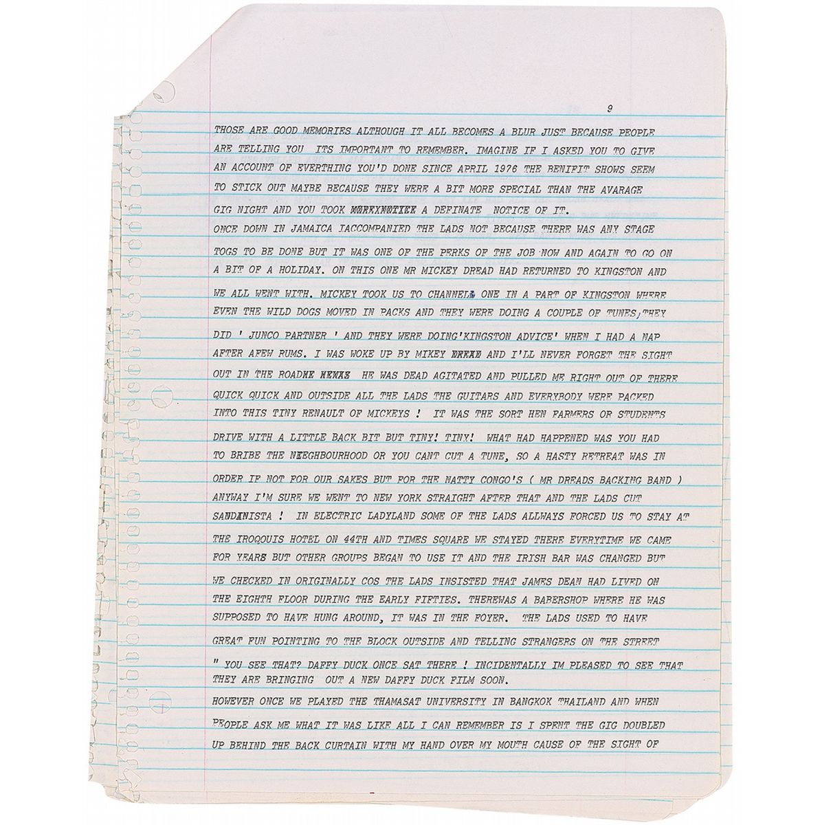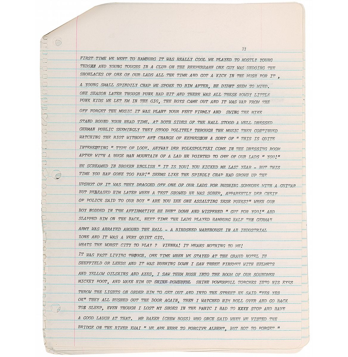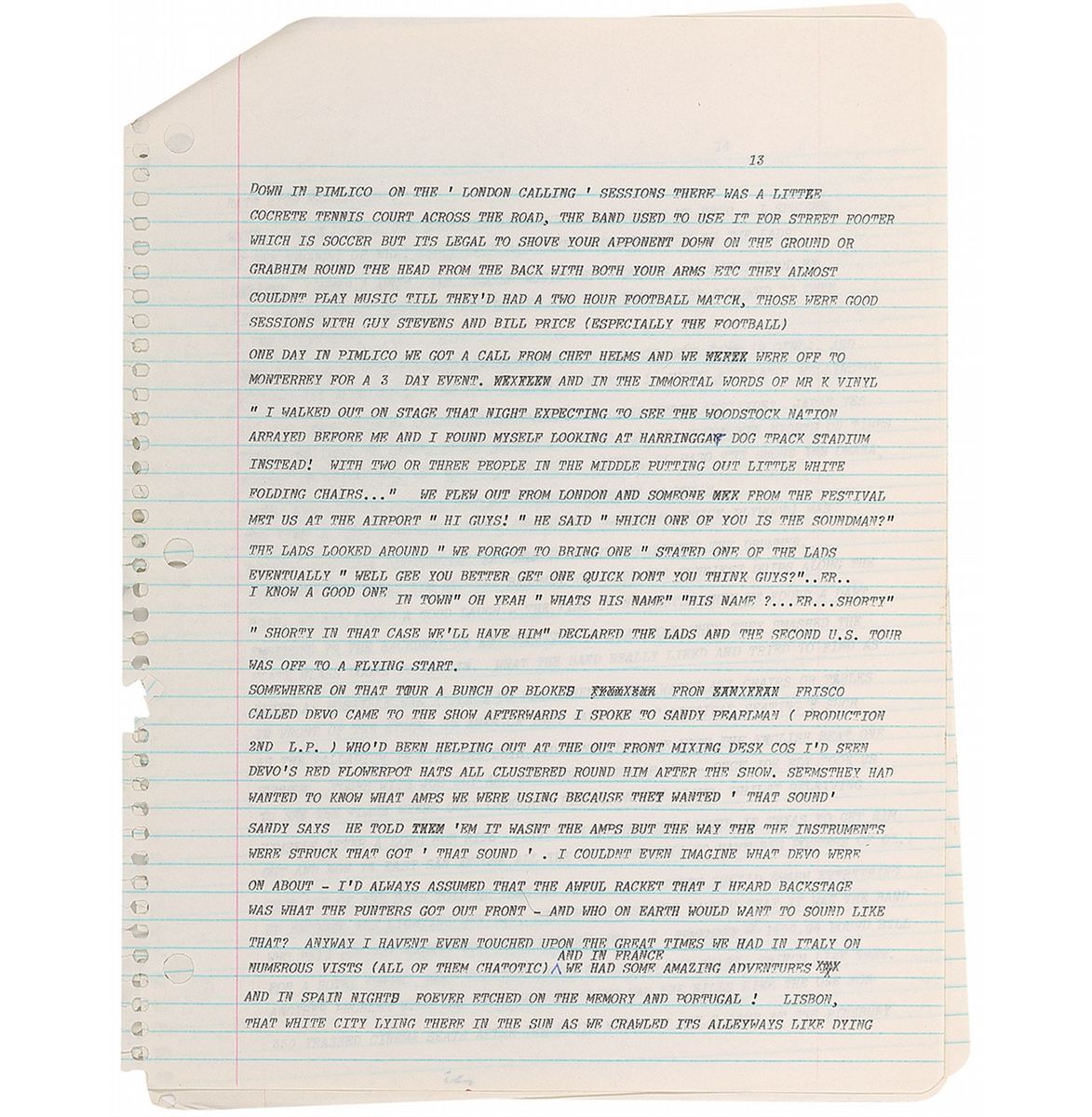 Typed manuscript draft for the liner notes to The Story of the Clash, Volume 1, 8.5 x 11, 15 lined pages, January 24, 1988. Strummer writes on the early days of the band under the pseudonym “Albert Transom,” the band's fictional valet, quoted in part below with spelling and grammar retained. He has added a handwritten notation and a few handwritten spelling and punctuation corrections throughout. It is an autobiographical tour de force—the only time Strummer ever wrote out the story of the Clash—that expounds on the band’s general history, their often violent exploits throughout the world, and their musical and political influences. Creases to lower left corners and a rough left edge due to removal from a notebook, otherwise fine condition.