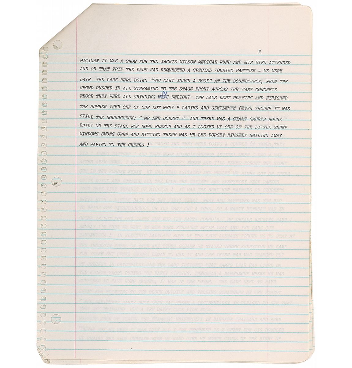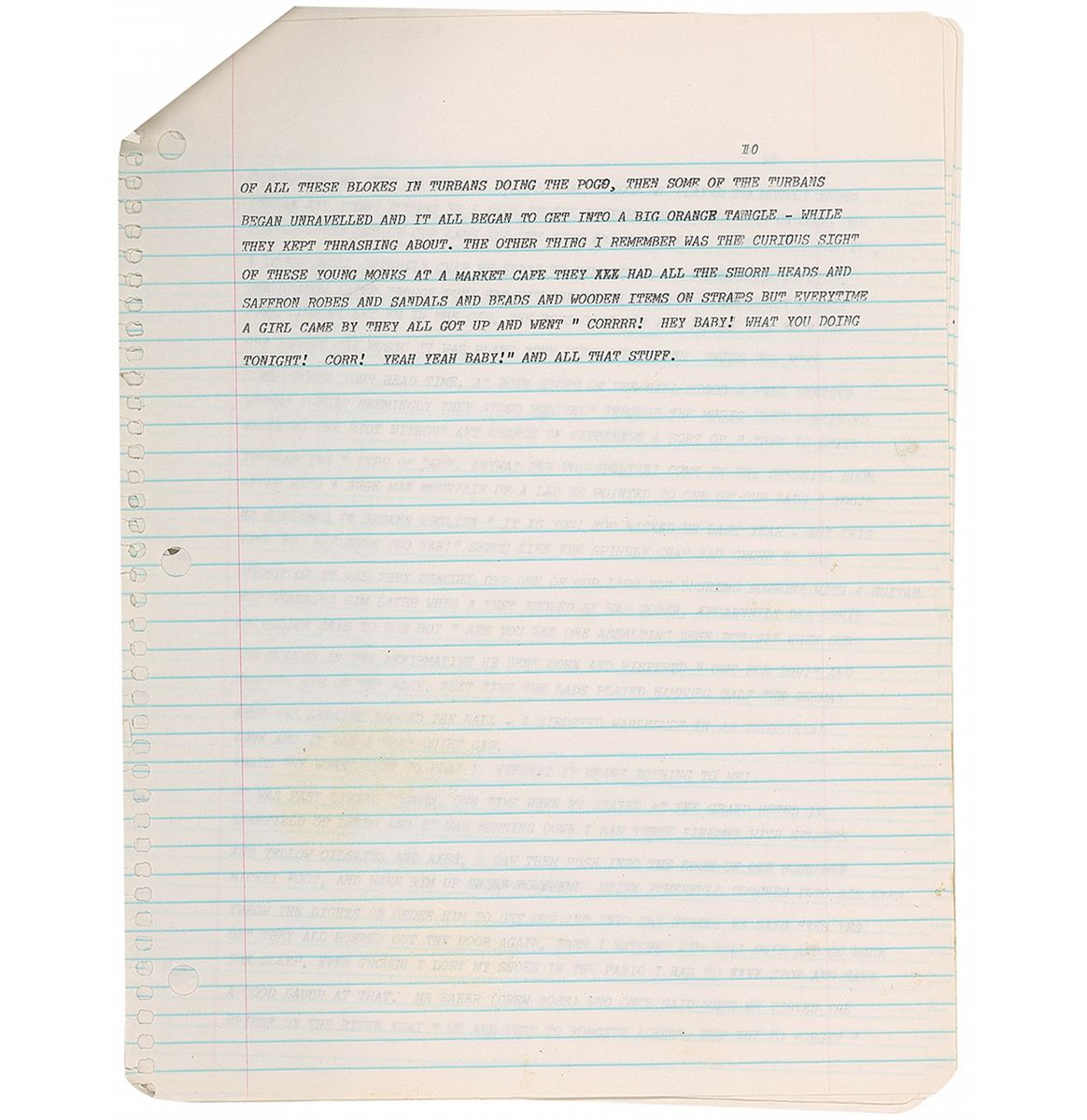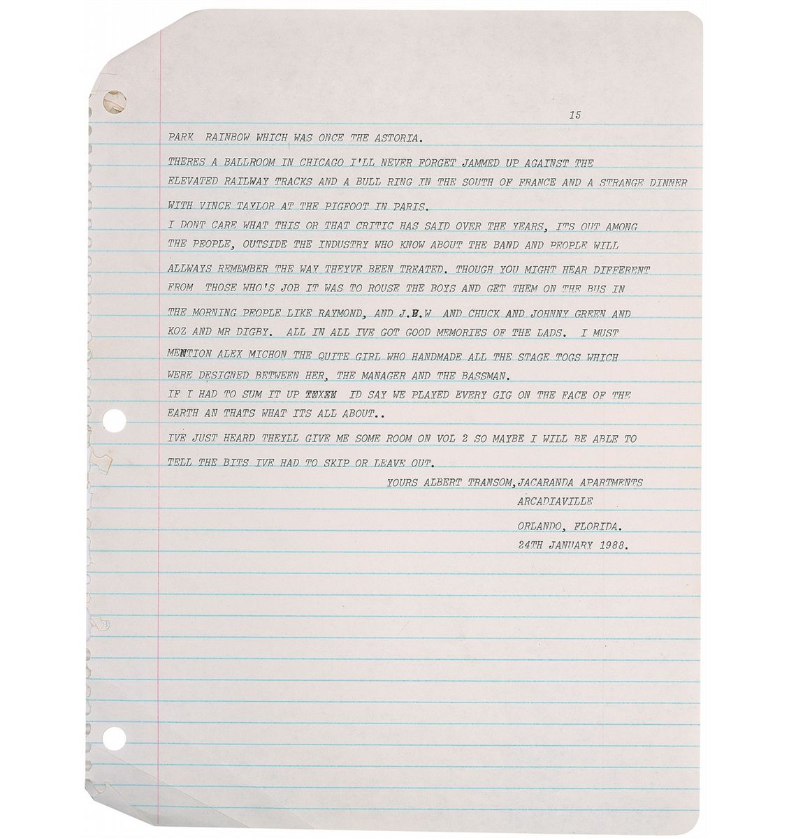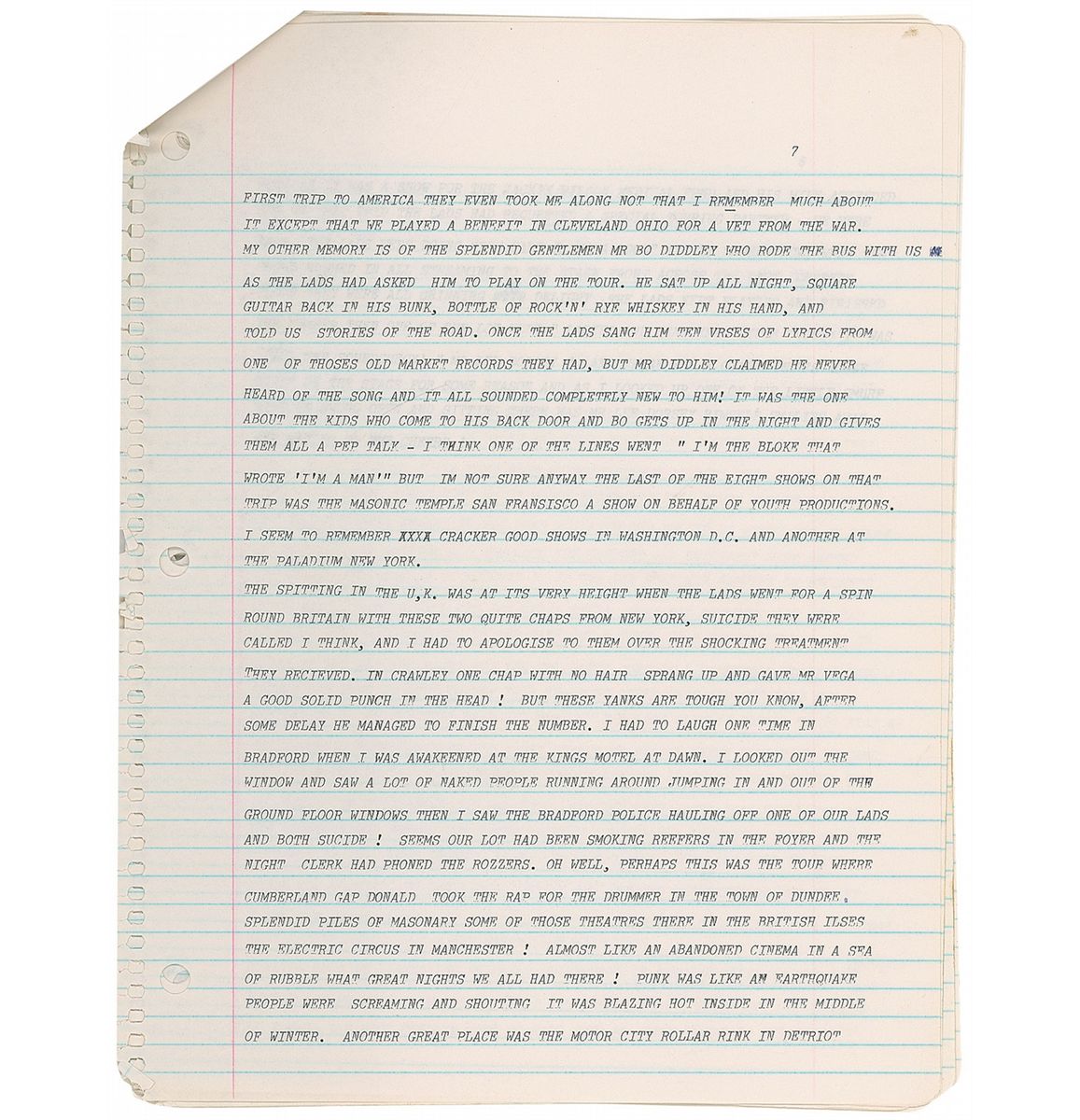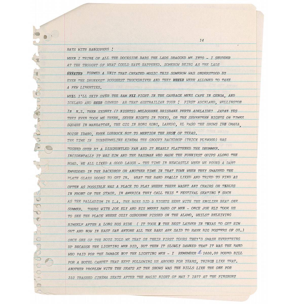 Typed manuscript draft for the liner notes to The Story of the Clash, Volume 1, 8.5 x 11, 15 lined pages, January 24, 1988. Strummer writes on the early days of the band under the pseudonym “Albert Transom,” the band's fictional valet, quoted in part below with spelling and grammar retained. He has added a handwritten notation and a few handwritten spelling and punctuation corrections throughout. It is an autobiographical tour de force—the only time Strummer ever wrote out the story of the Clash—that expounds on the band’s general history, their often violent exploits throughout the world, and their musical and political influences. Creases to lower left corners and a rough left edge due to removal from a notebook, otherwise fine condition.