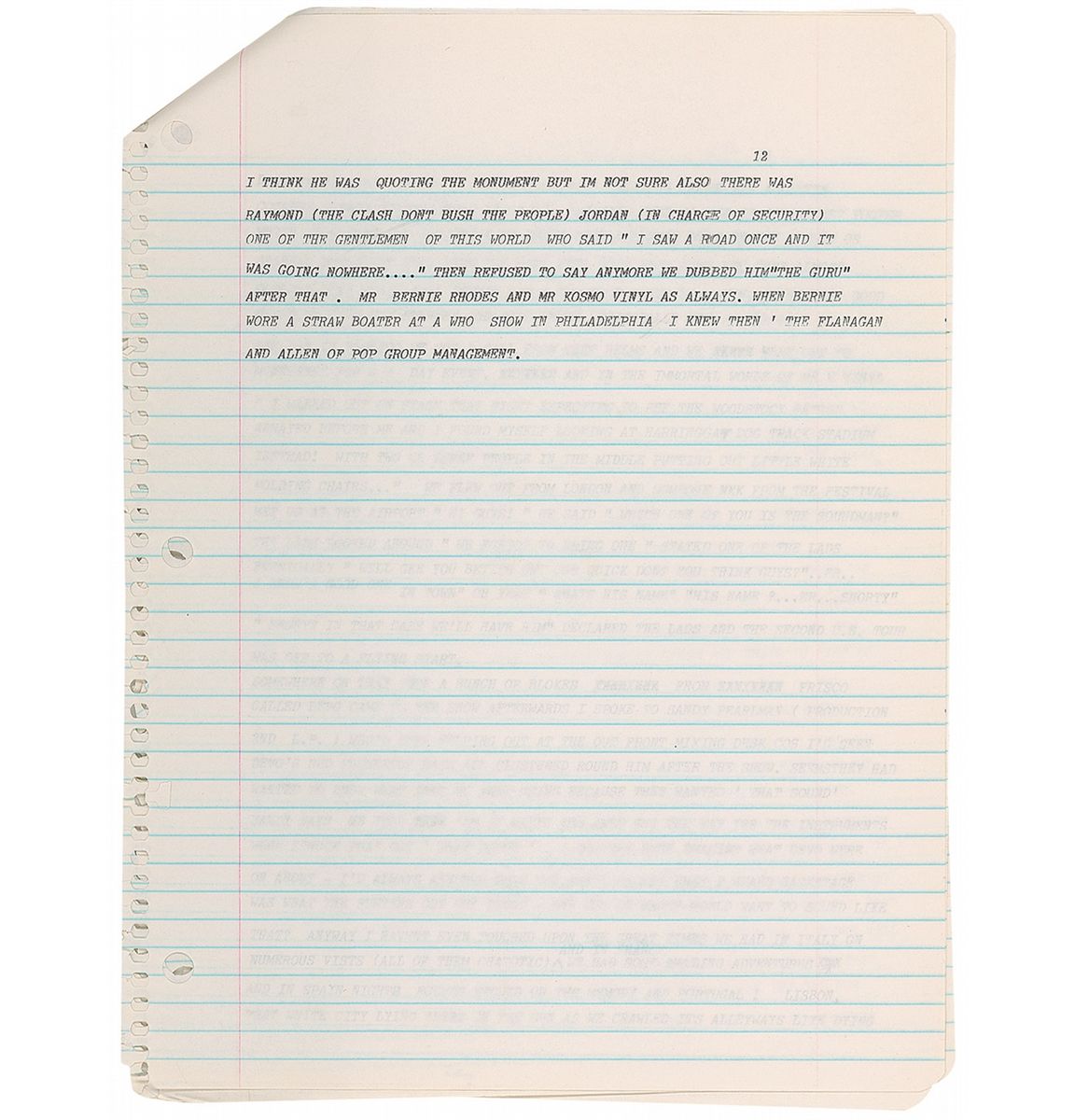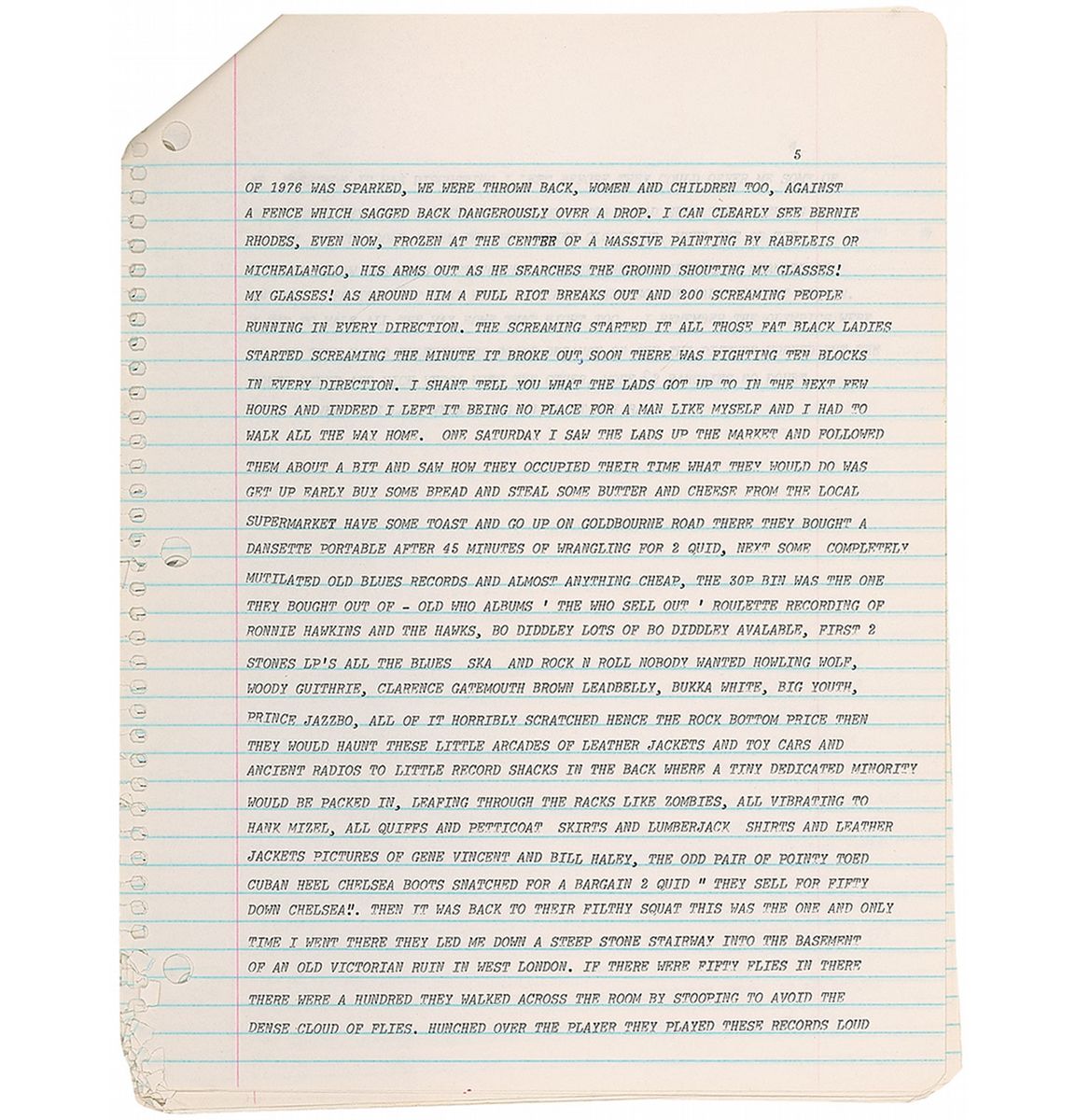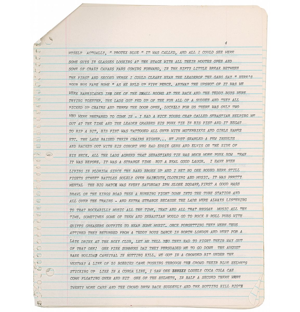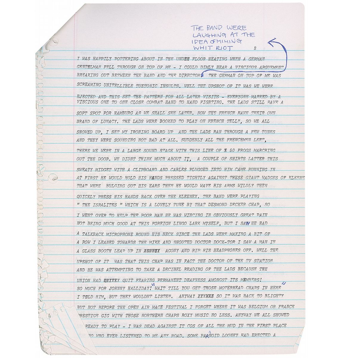 At one point, Strummer writes about his experience at the Notting Hill Carnival of 1976, where “a line of 20 bobbies came pushing through the crowd…one lonely Coca Cola can come floating over and hit one of the helmets, in half a second there were twenty more cans and the crowd drew back suddenly and the Notting Hill riot of 1976 was sparked...soon there was fighting ten blocks in every direction.” These were the riots that served as inspiration for the band’s first single, ‘White Riot,’ released in 1977. One of the first things Strummer writes about is a rehearsal for a television performance of the song: “The lads were doing this tune White Riot…I could dimly hear a viscious argument breaking out between the band and the director [handwritten addendum: the band were laughing at the idea of miming Whit Riot]…we were ejected and this set the pattern for all later visits—everyone marked by a viscious one to one close combat hand to hand fighting.” If their recording sessions were marked by skirmishes, Clash concerts could turn into all-out street warfare.